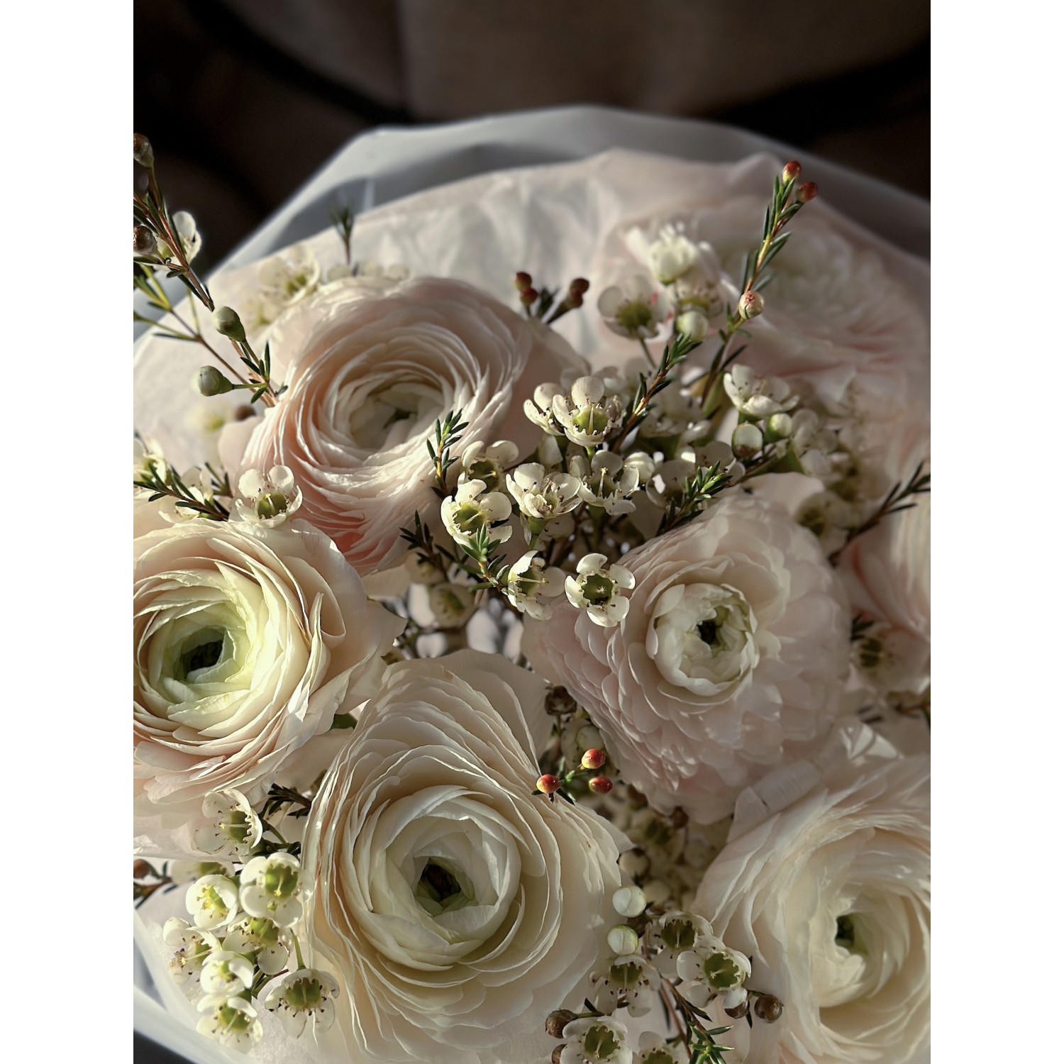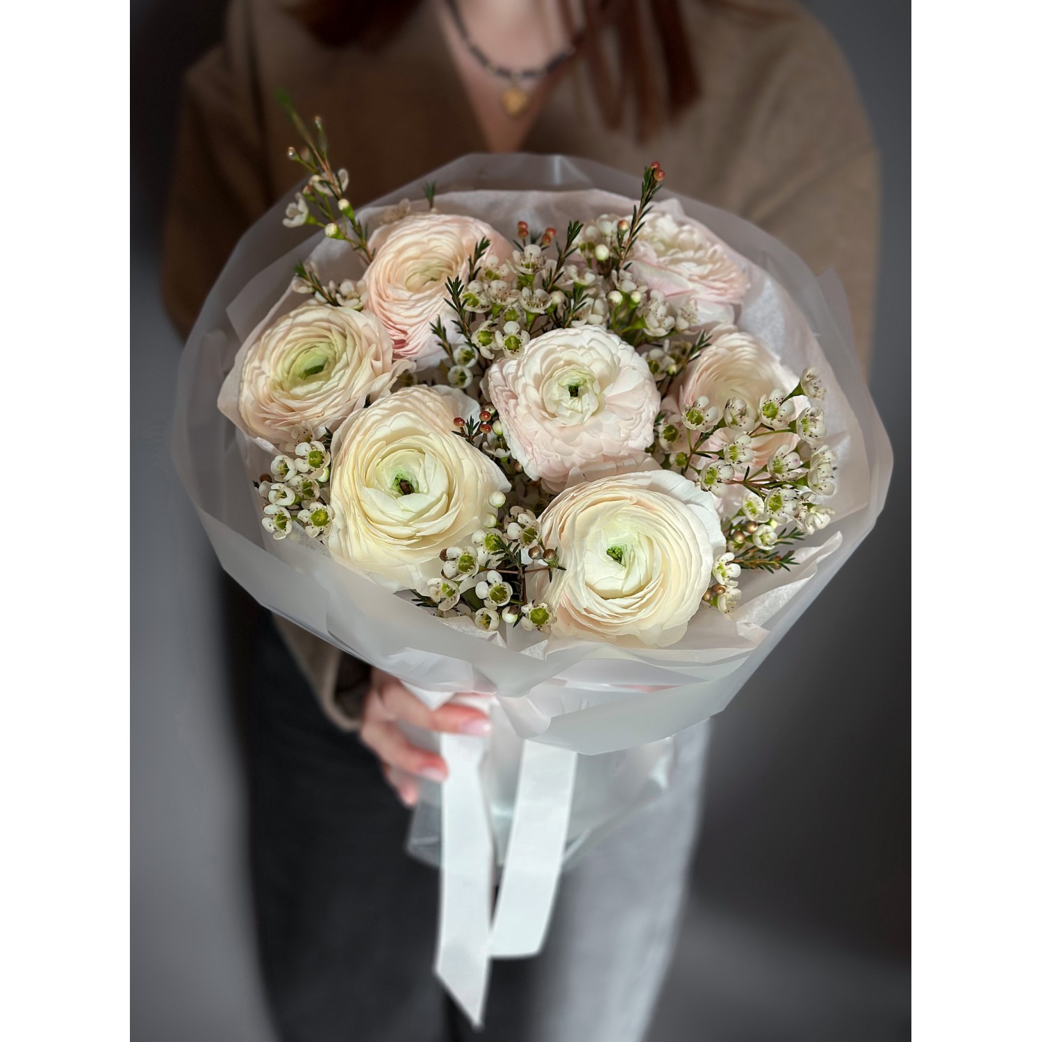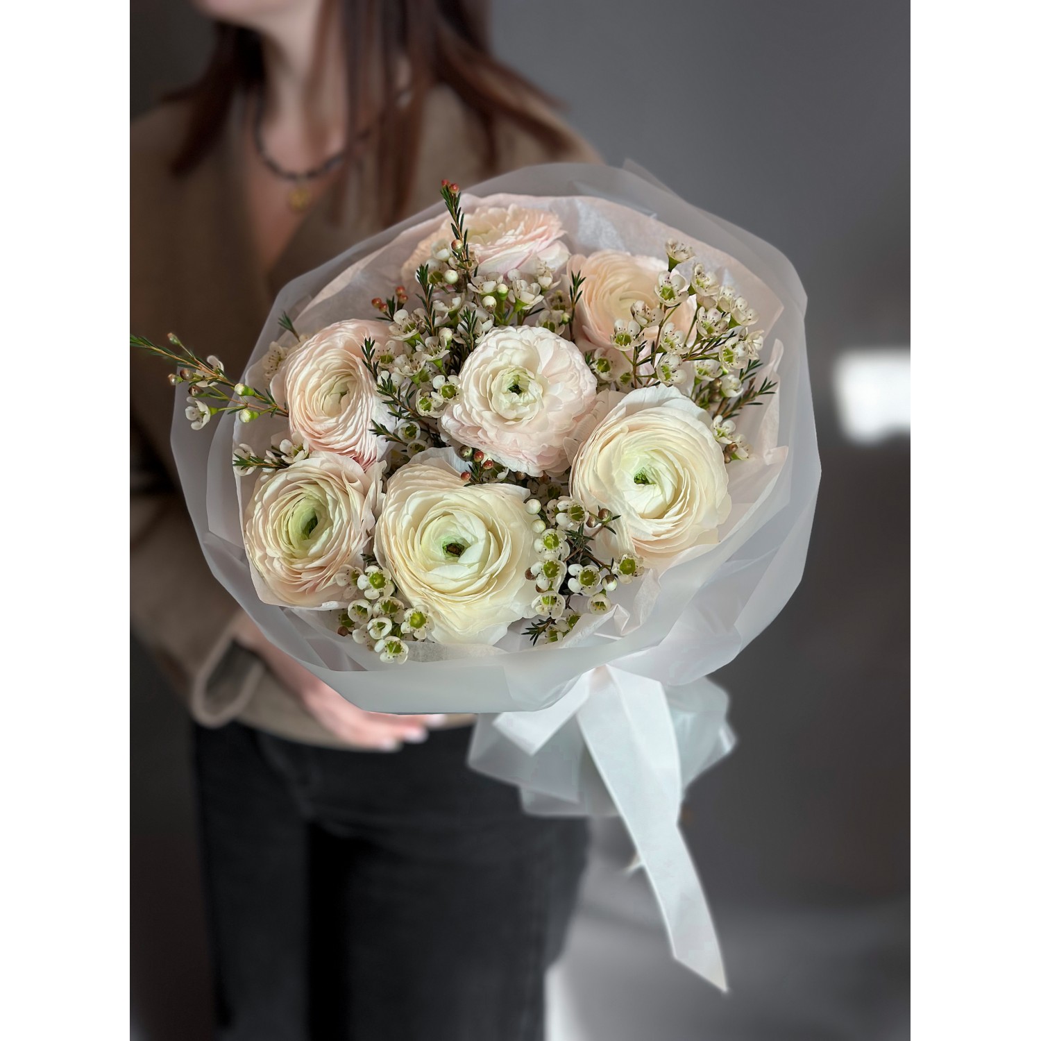 Букет с особым шармом, в лучших традициях французского шика - это дуэт ранункулюсов Cloni Hanoi и ваксфлауэра сорта White.