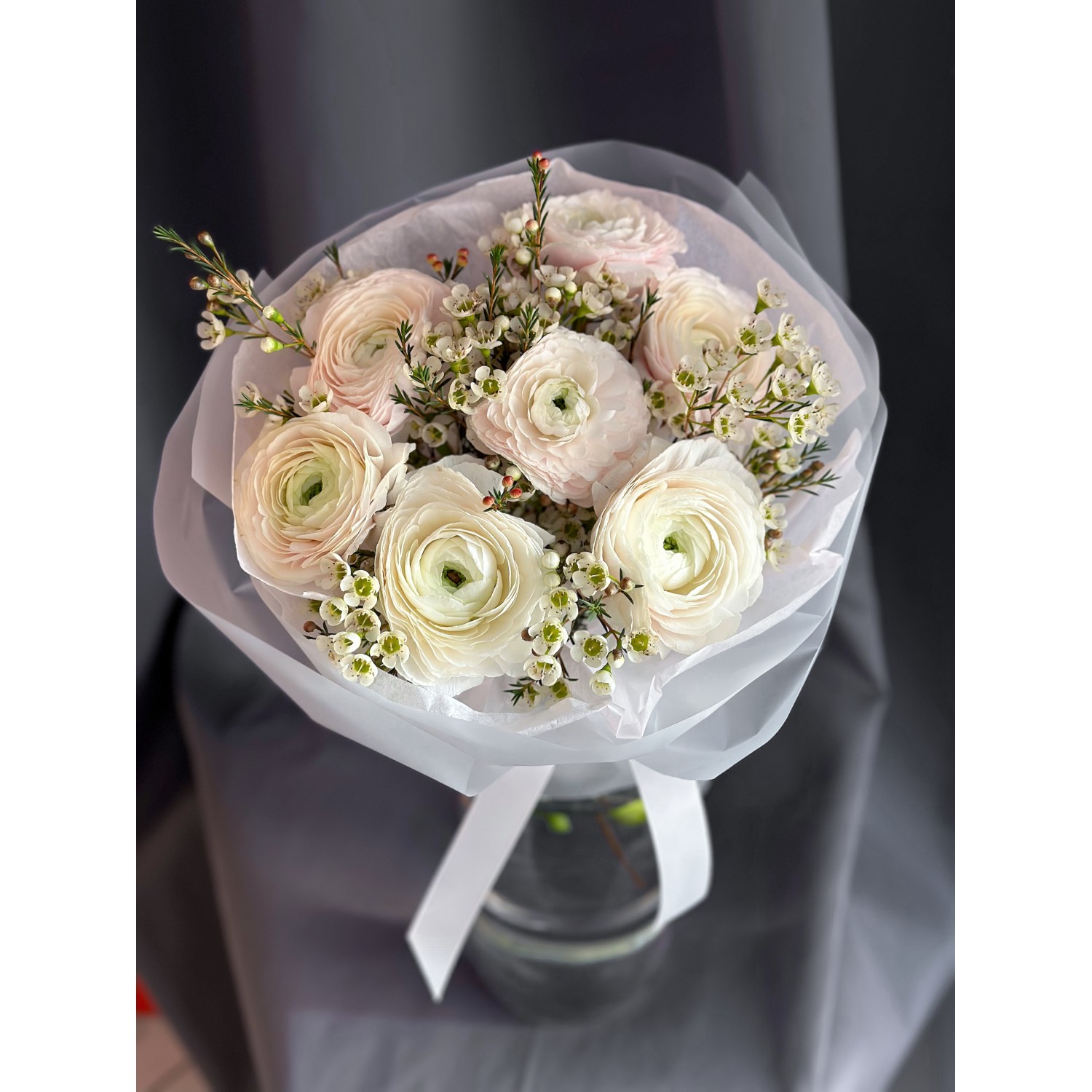 Букет №238 из ранункулюсов Cloni Hanoi и Ваксфлауэра