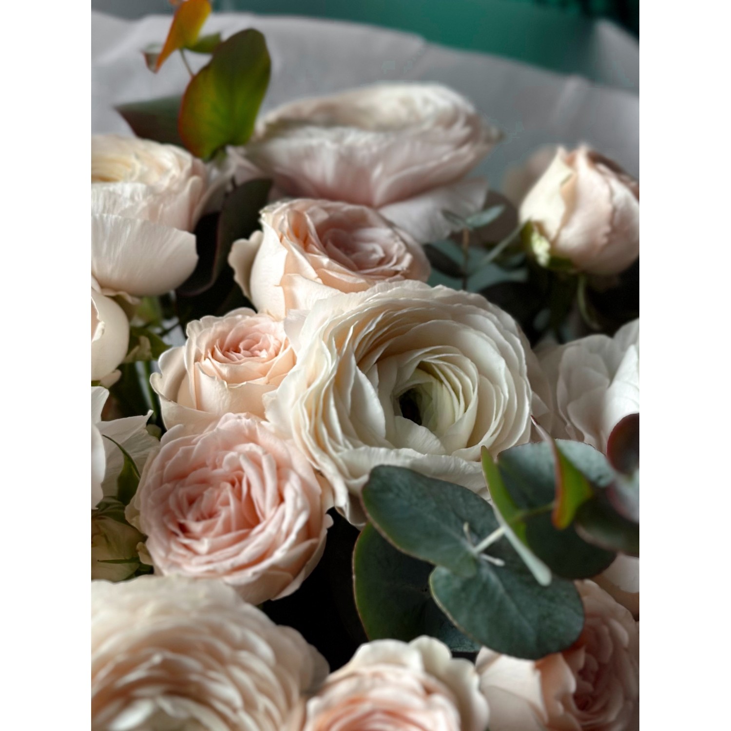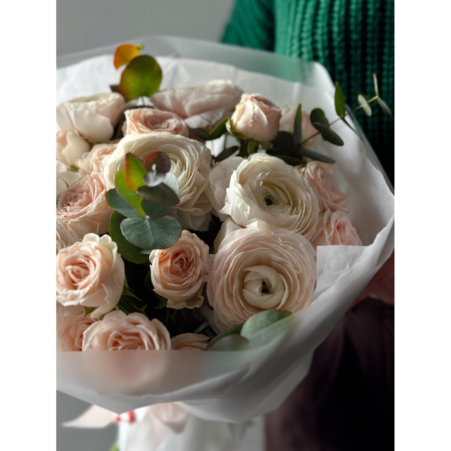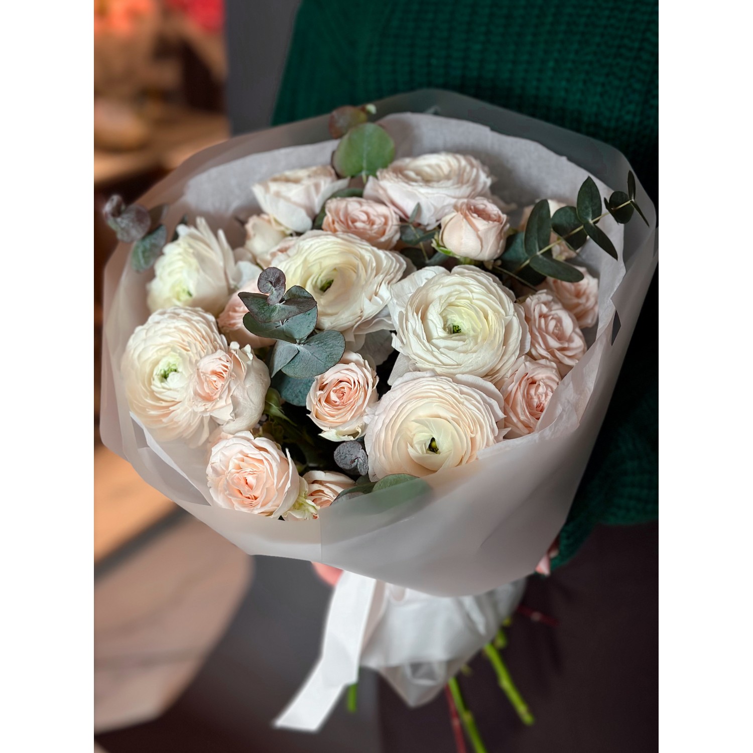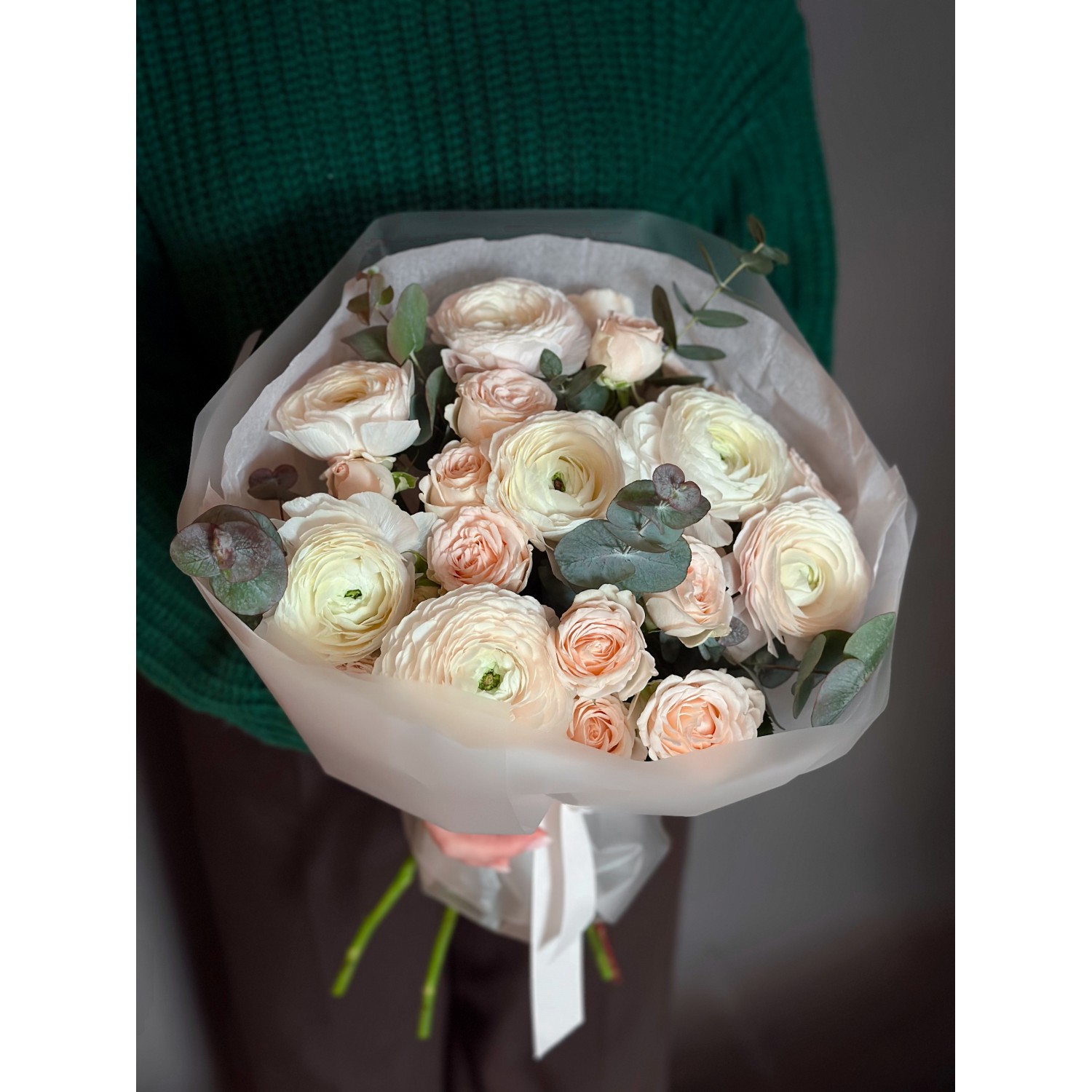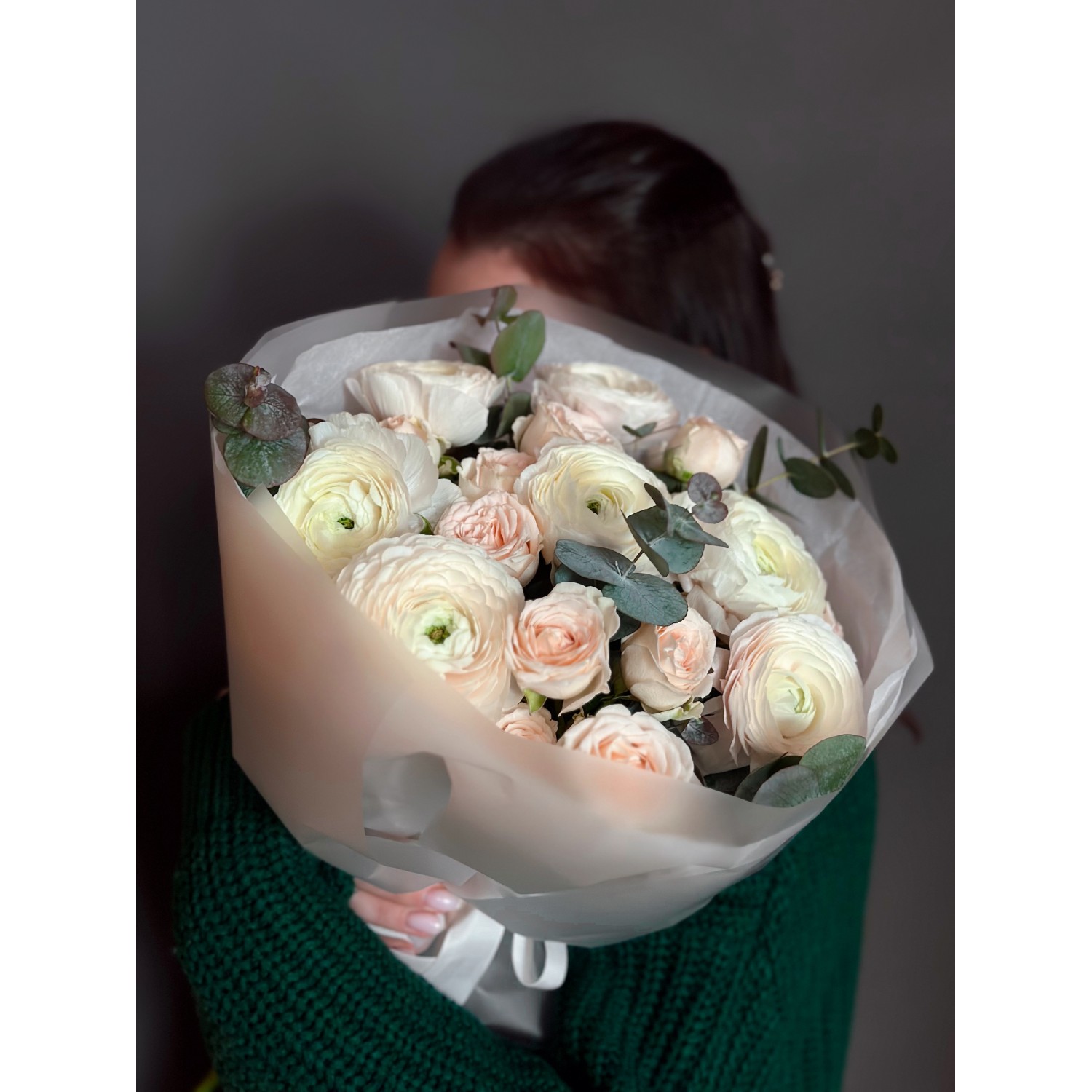 Букет с особым шармом, в лучших традициях французского шика - это дуэт ранункулюсов Cloni Hanoi и кустовой пионовидной розой.
