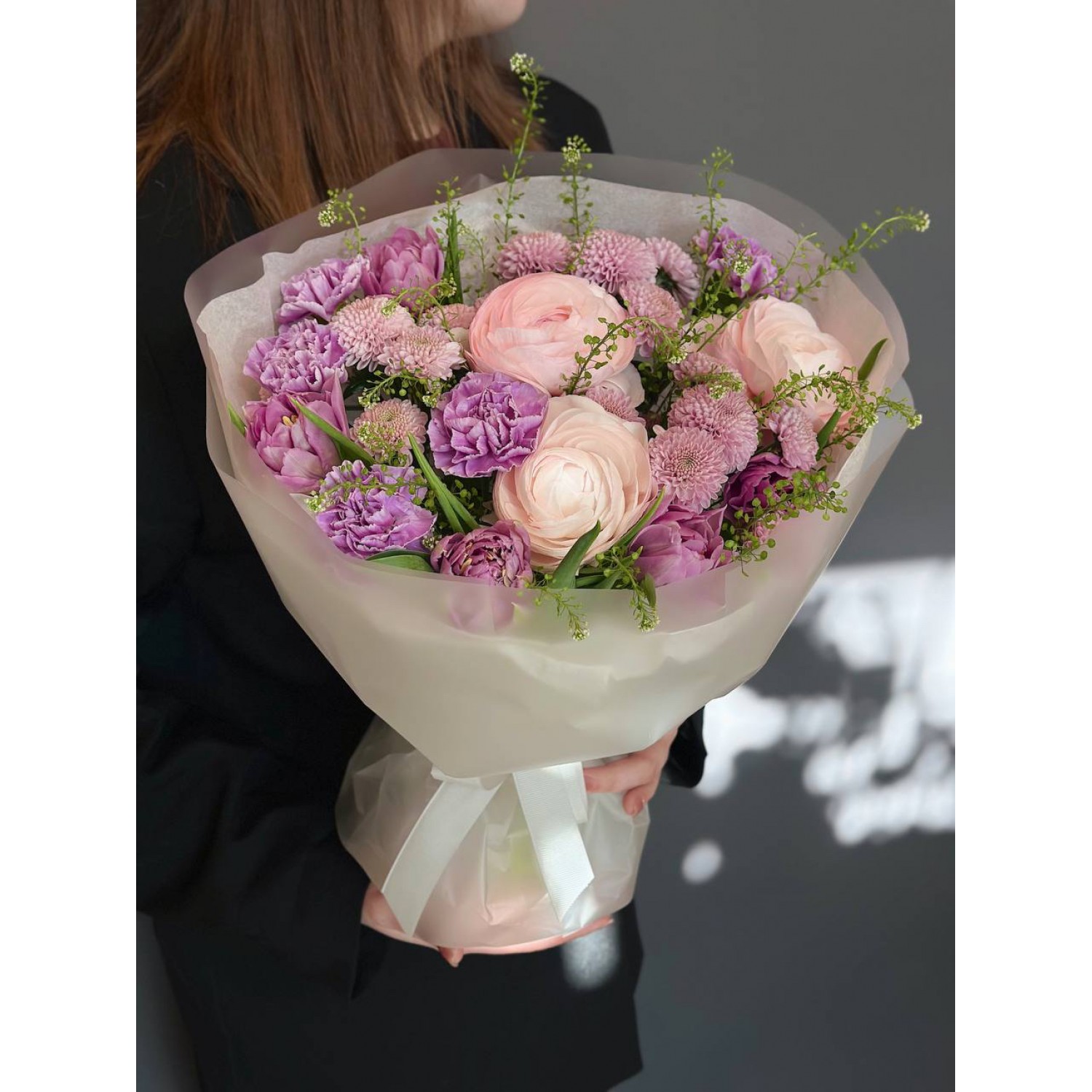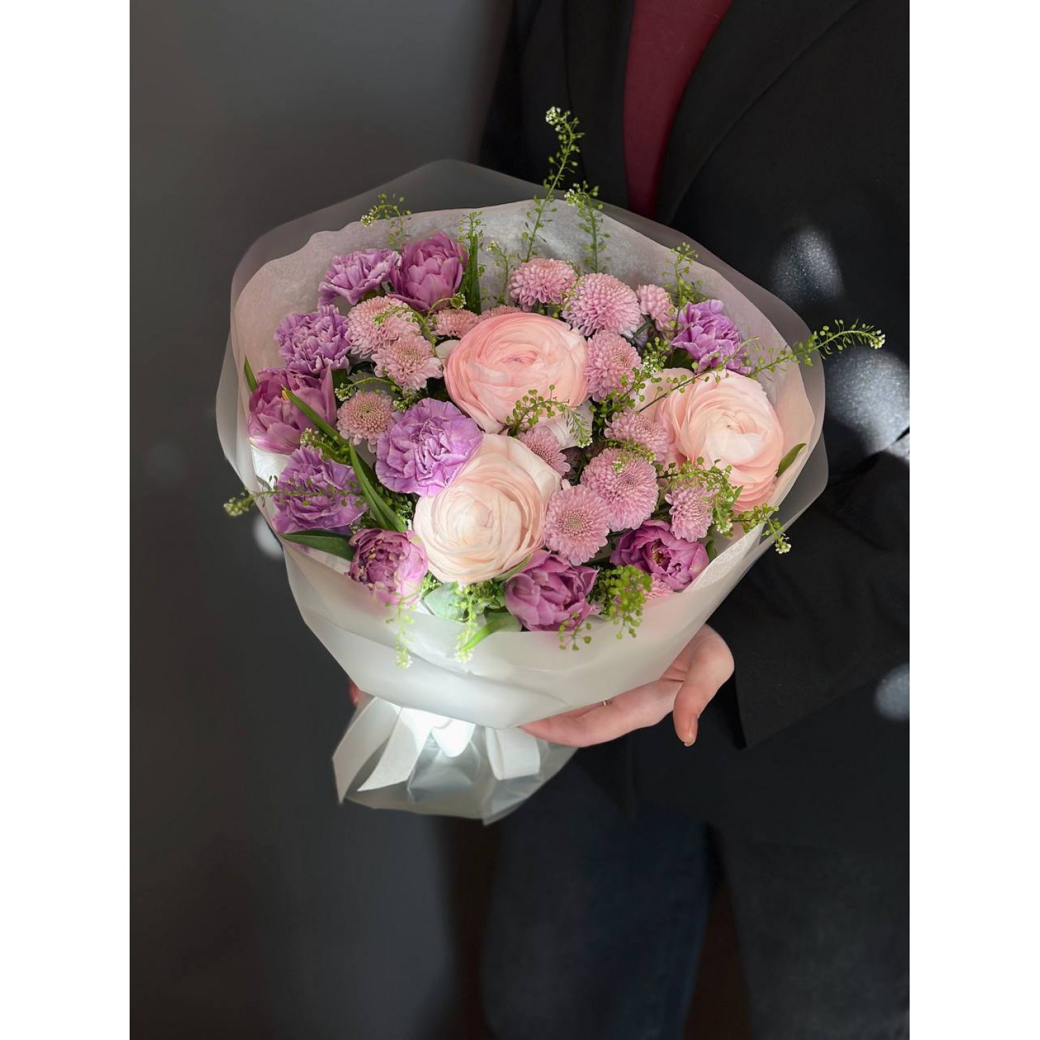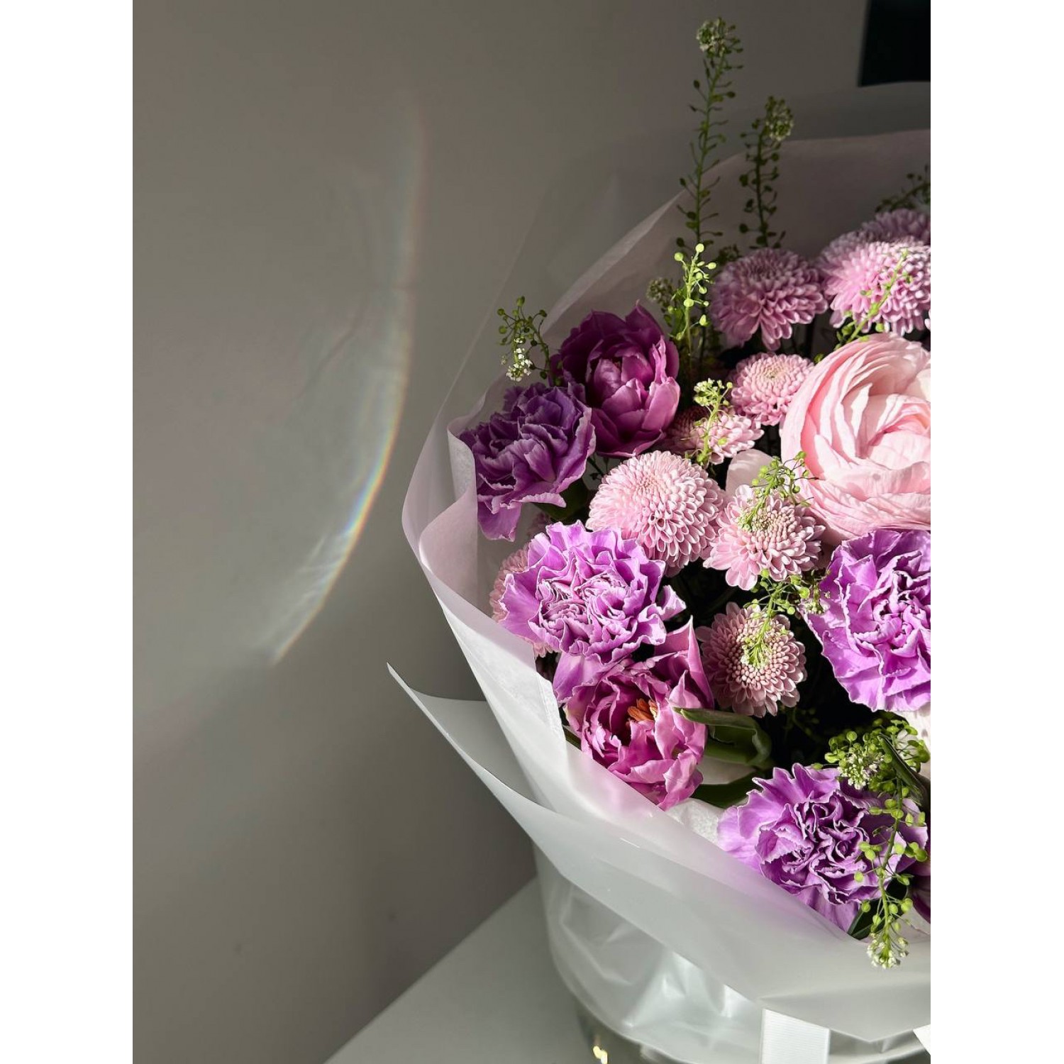 Элегантная и нежная охапка сразу из нескольких сортовых цветов - пионовидных лавандовых тюльпанов, кустовой розовой хризантемы, ранункулюсов Clooney Hanoi