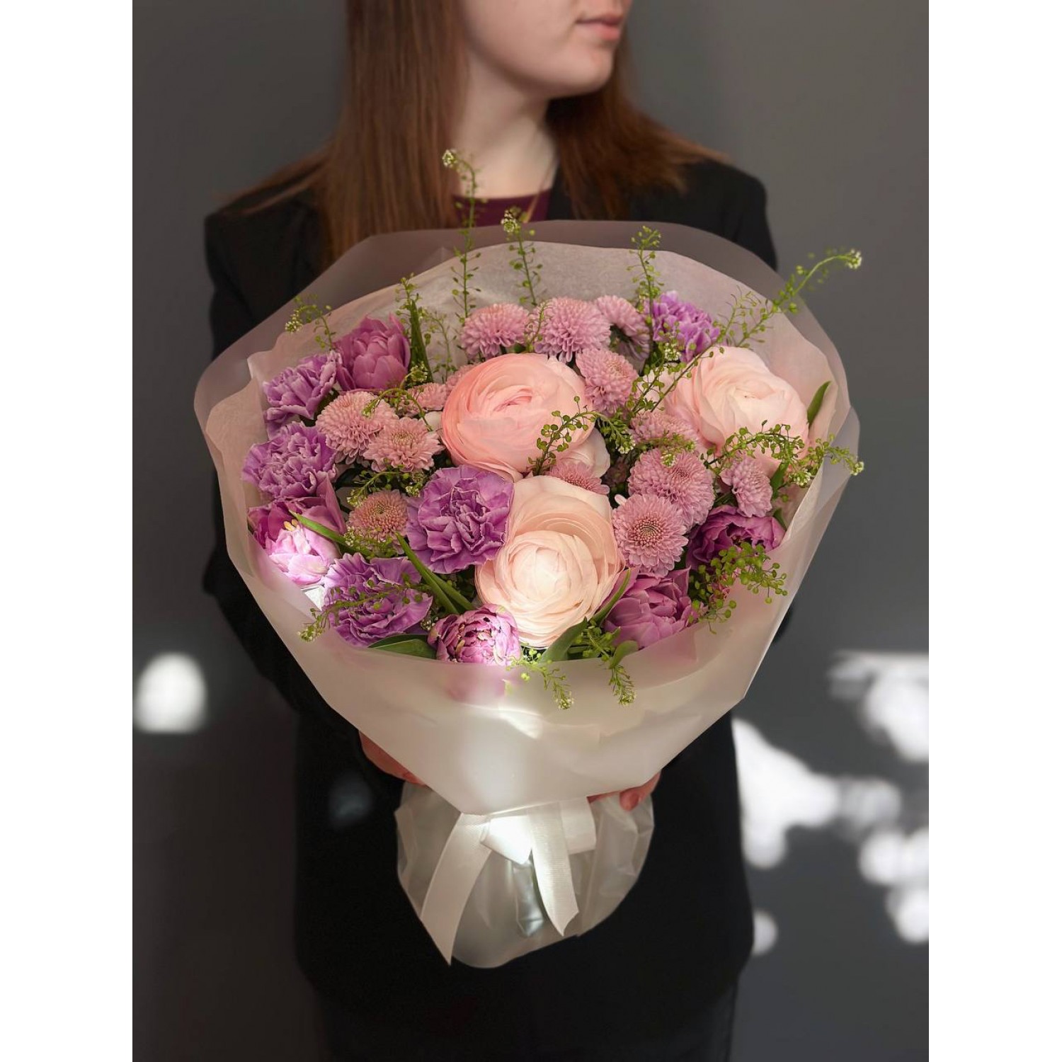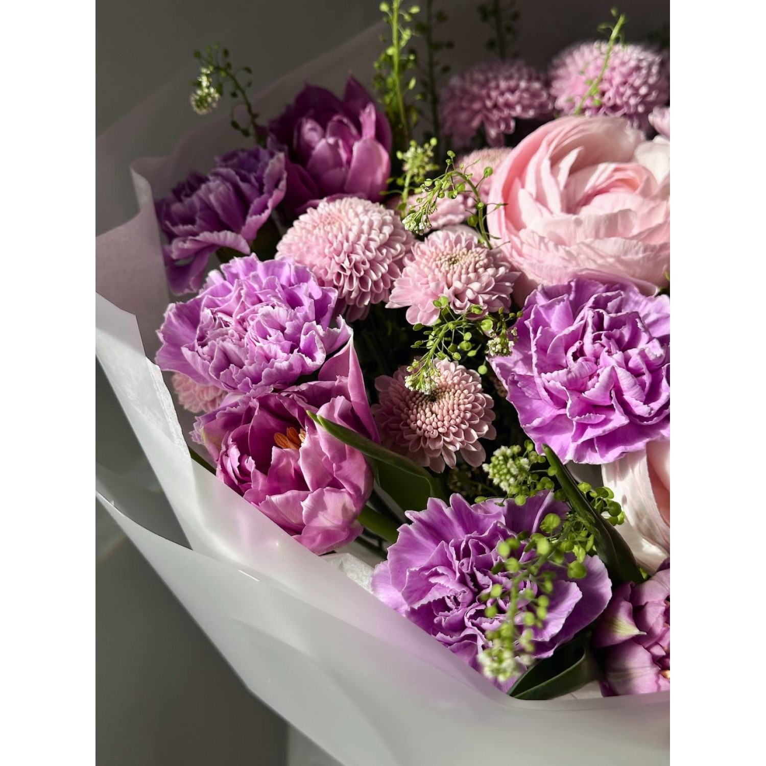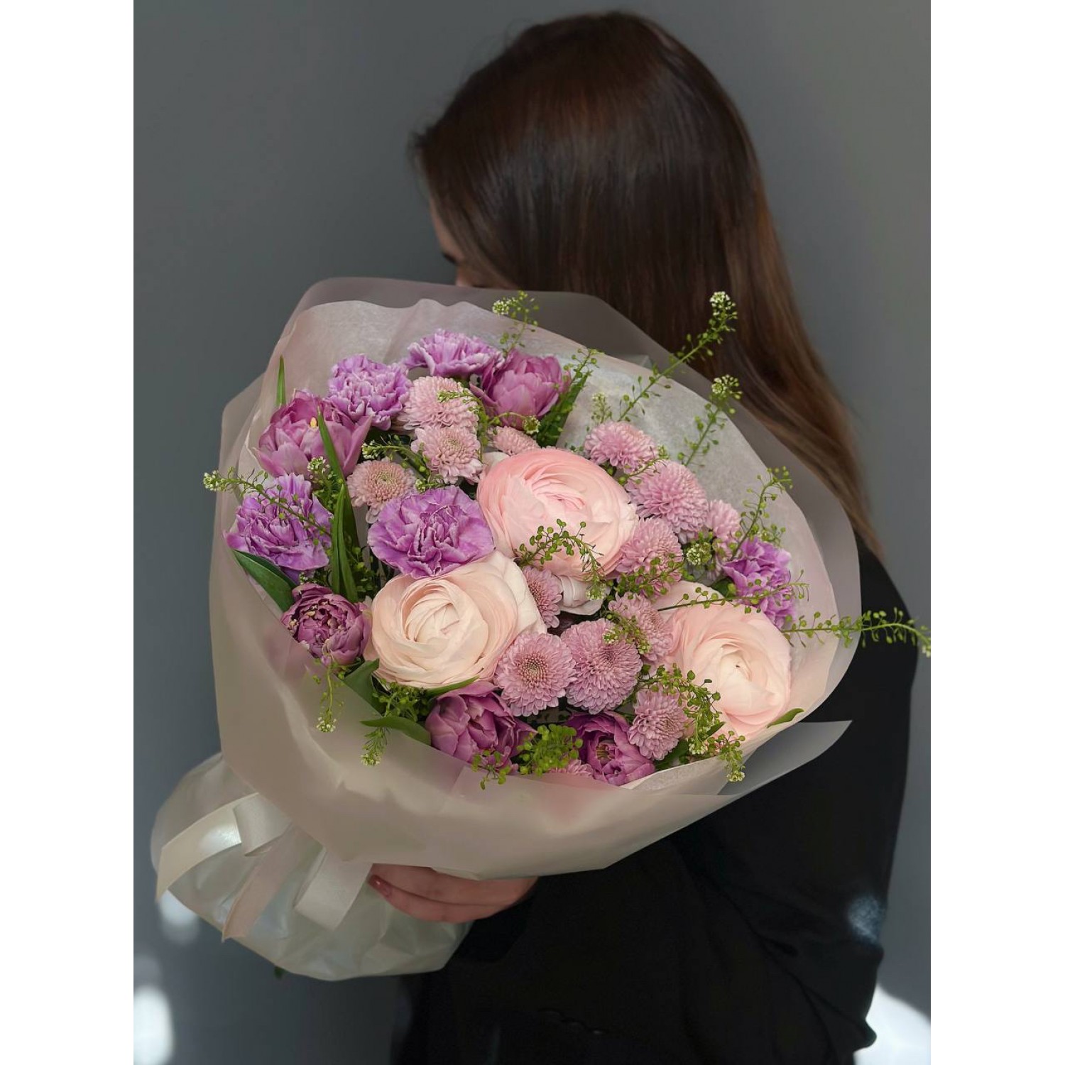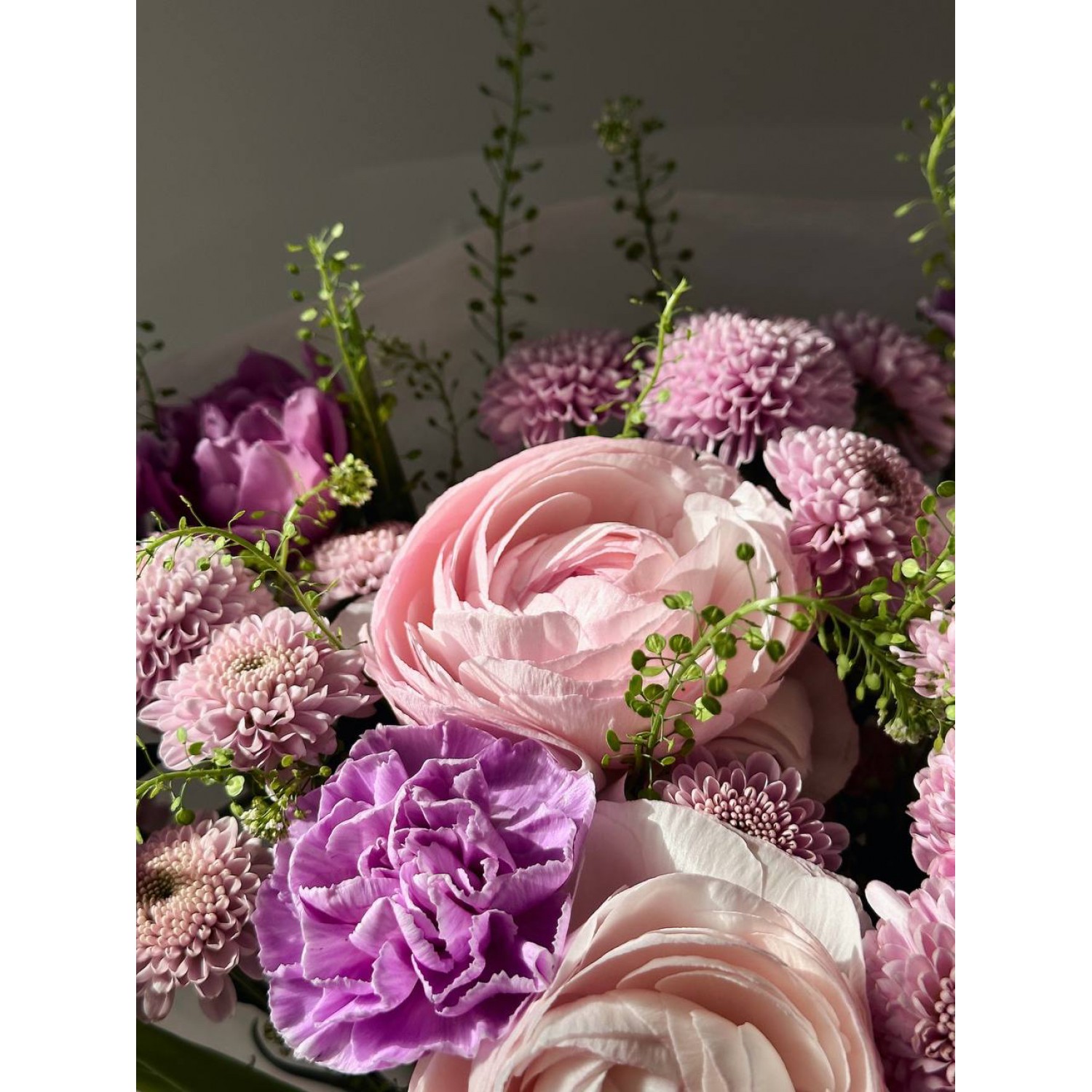 Элегантная и нежная охапка сразу из нескольких сортовых цветов - пионовидных лавандовых тюльпанов, кустовой розовой хризантемы, ранункулюсов Clooney Hanoi
