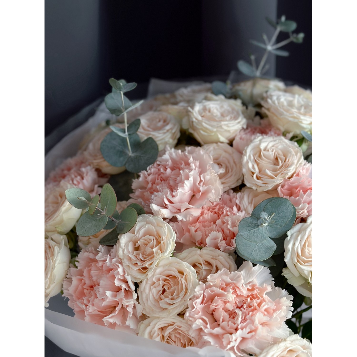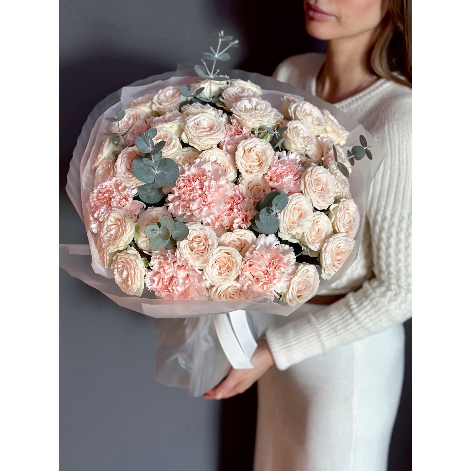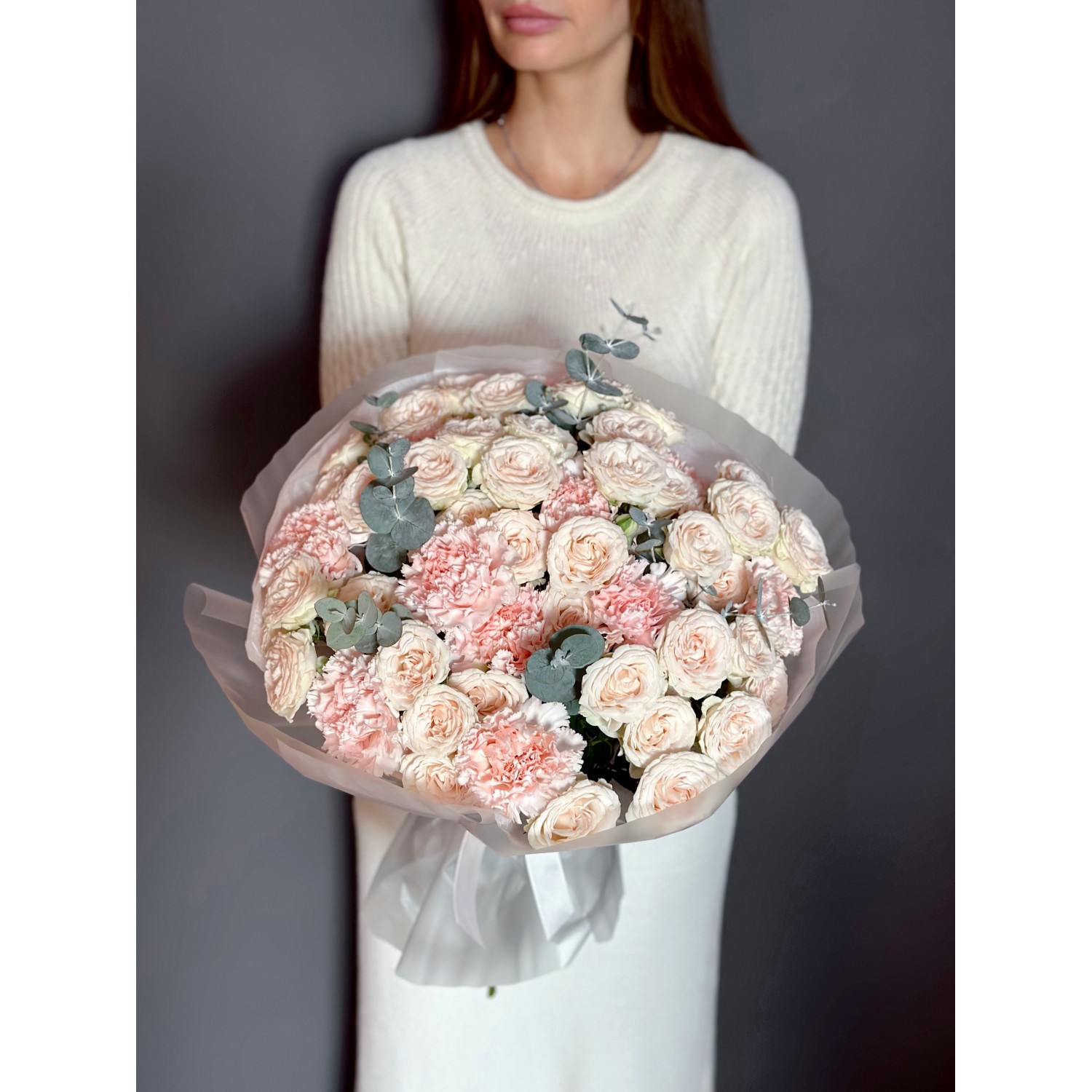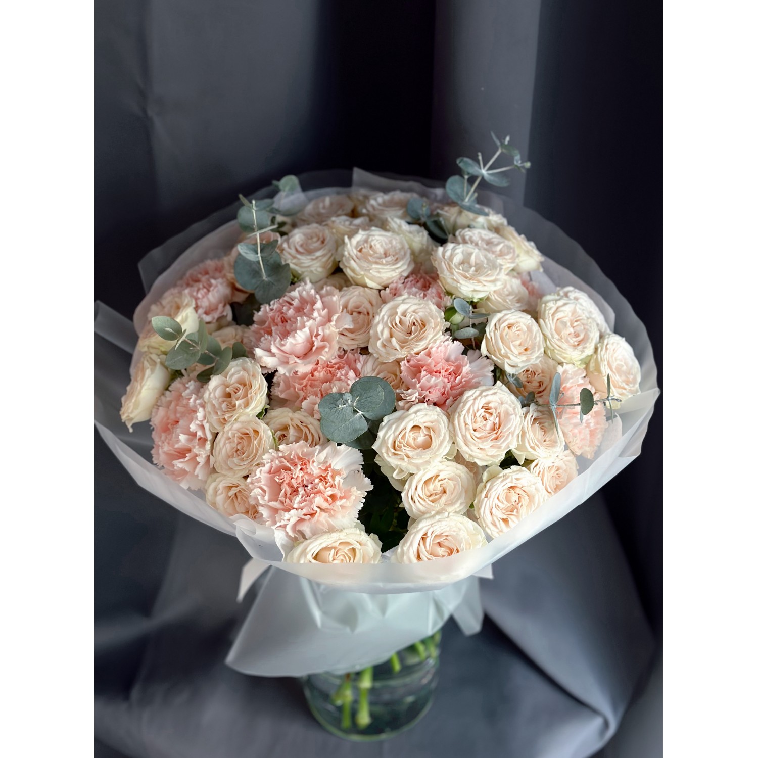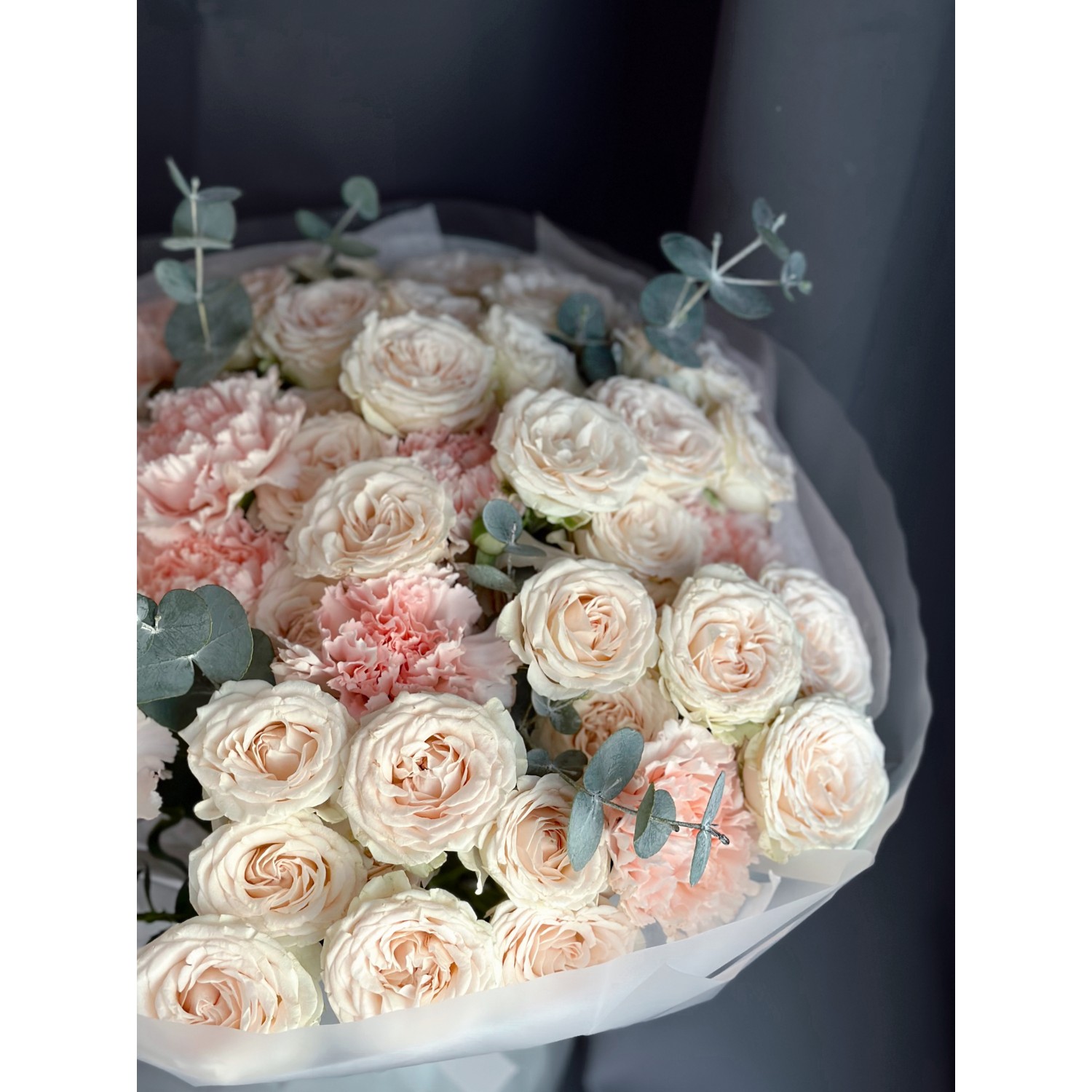 Букет №229 из кустовой пионовидной розы, сортовой гвоздики и эвкалипта
