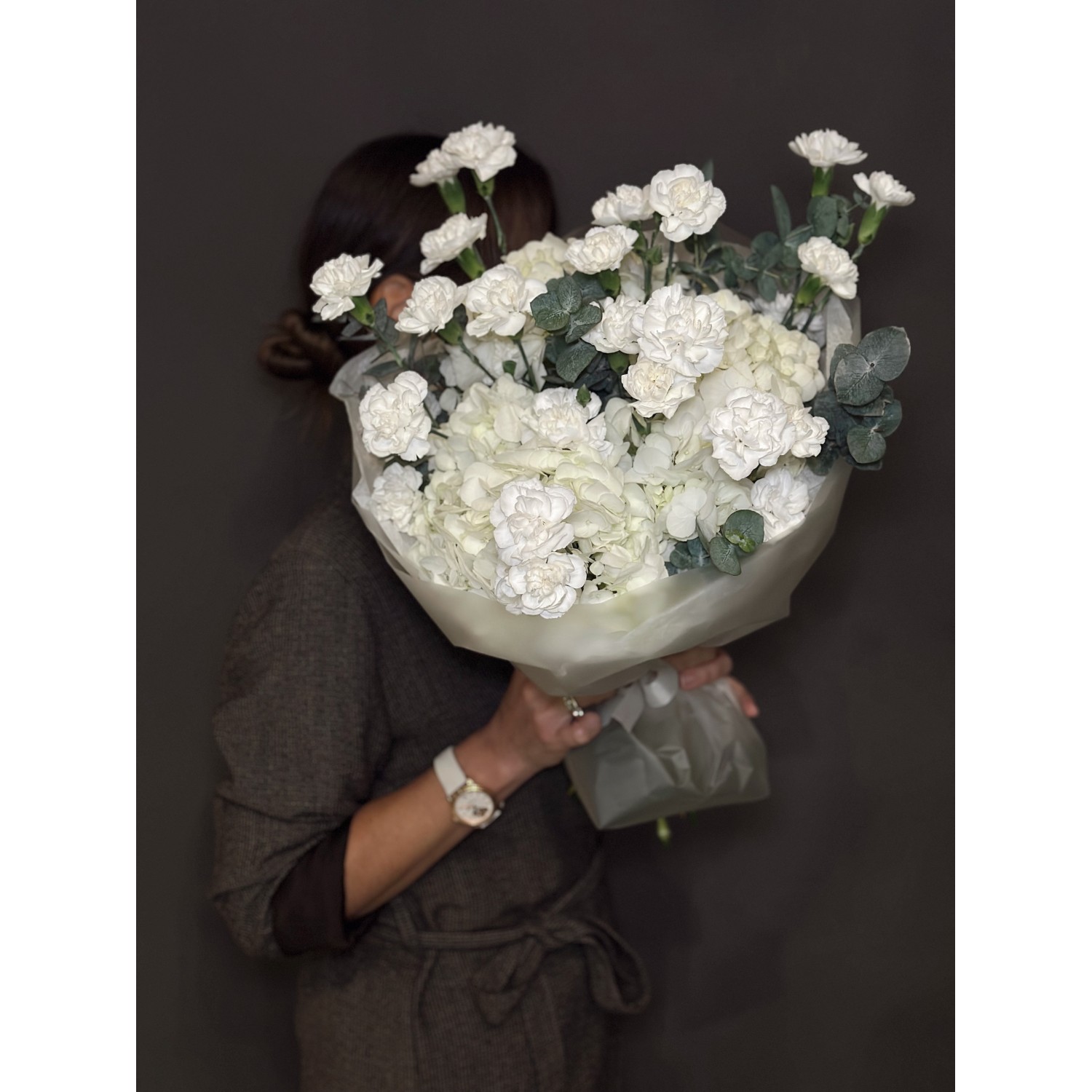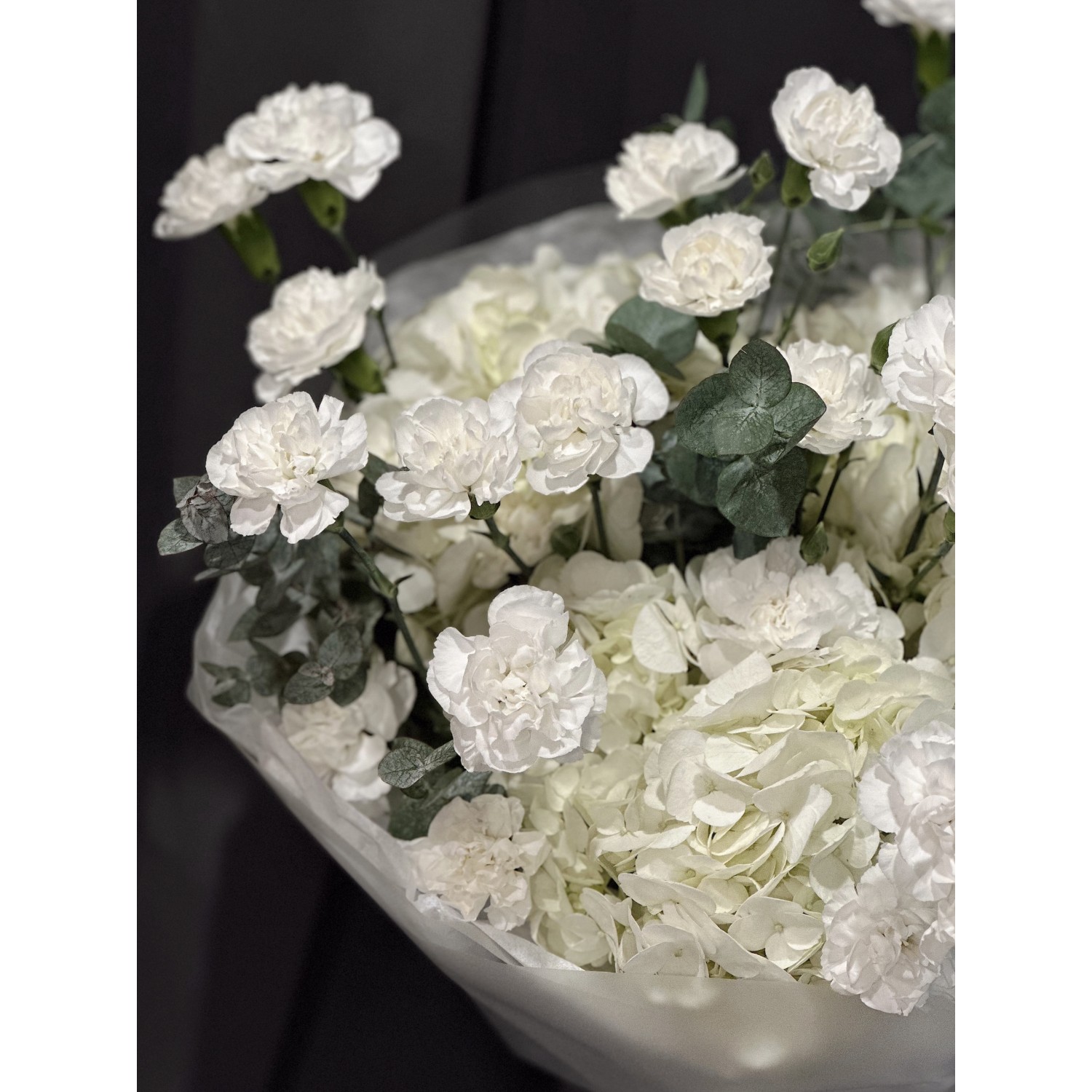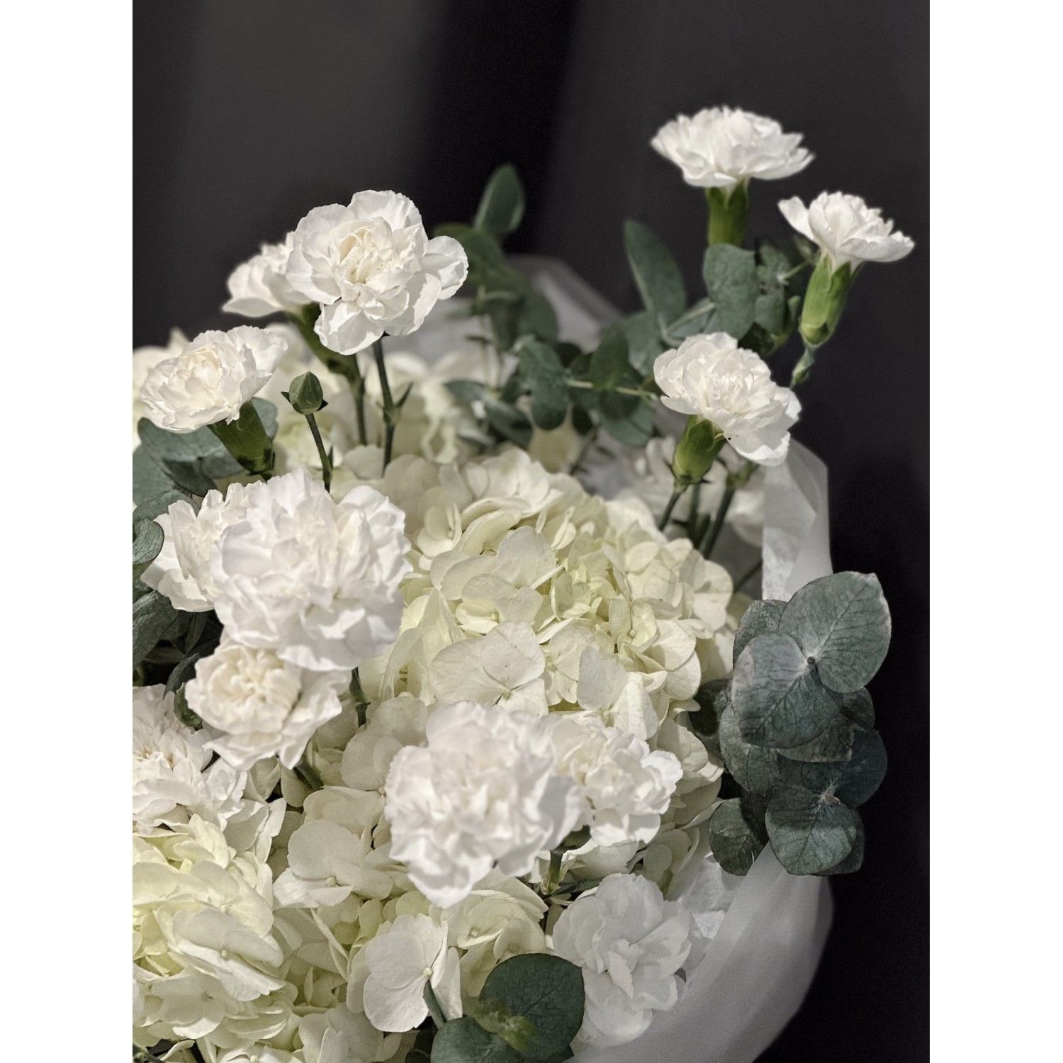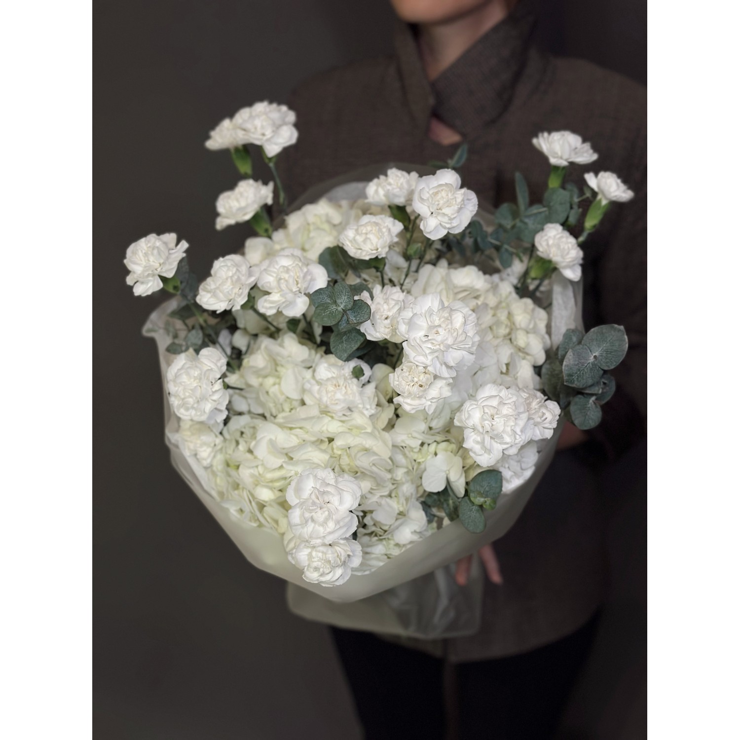 Летний по настроению, но всегда доступный по сезону микс из любимых цветов - кустовая гвоздика и белая гортензия - это идеальный состав из фактурных и ароматных соцветий. Букет, который притягивает внимание с первого взгляда за сочетания множества бутонов и нежных оттенков! Букет идеально подходит для декора интерьеров дома и офиса, на это следует обратить внимание тем, кто не мыслит свой день без живых цветов.