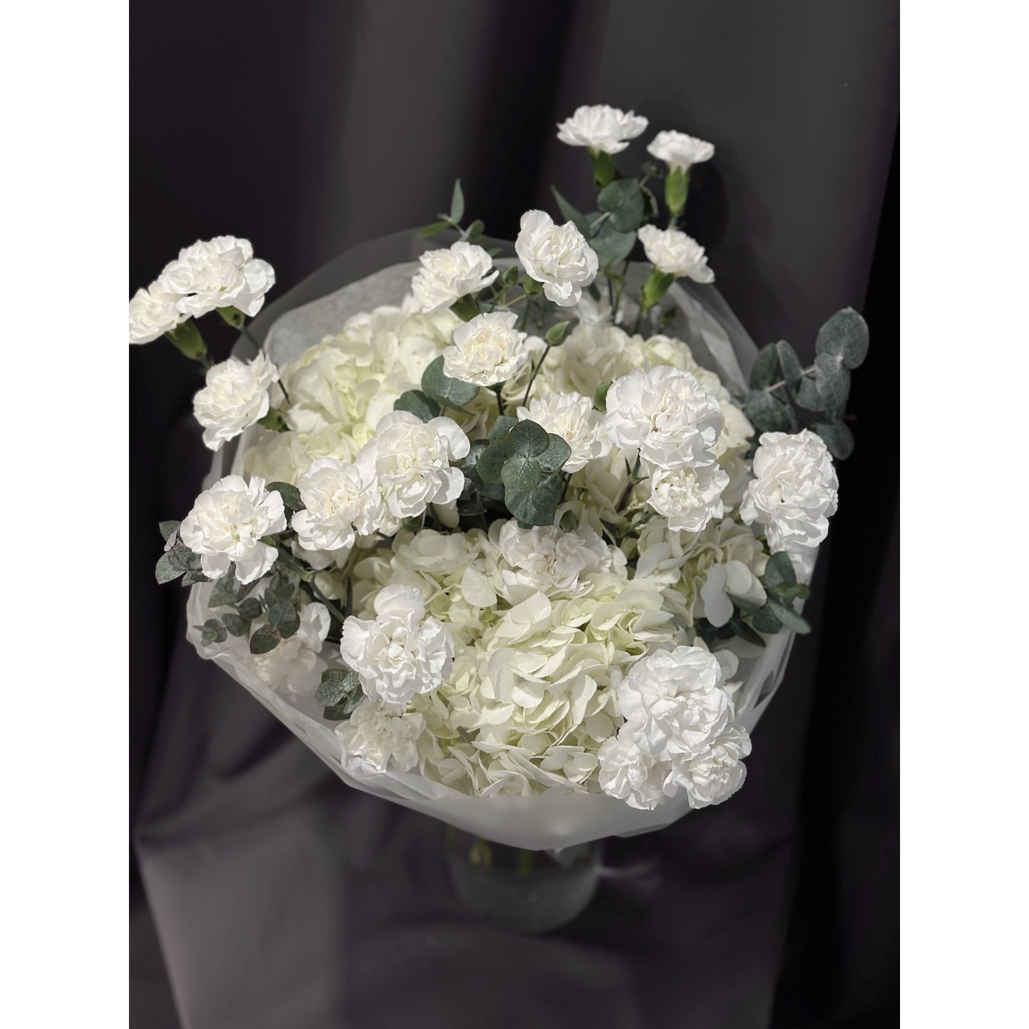 Букет №234 из сортовой кустовой гвоздики и белой гортензии