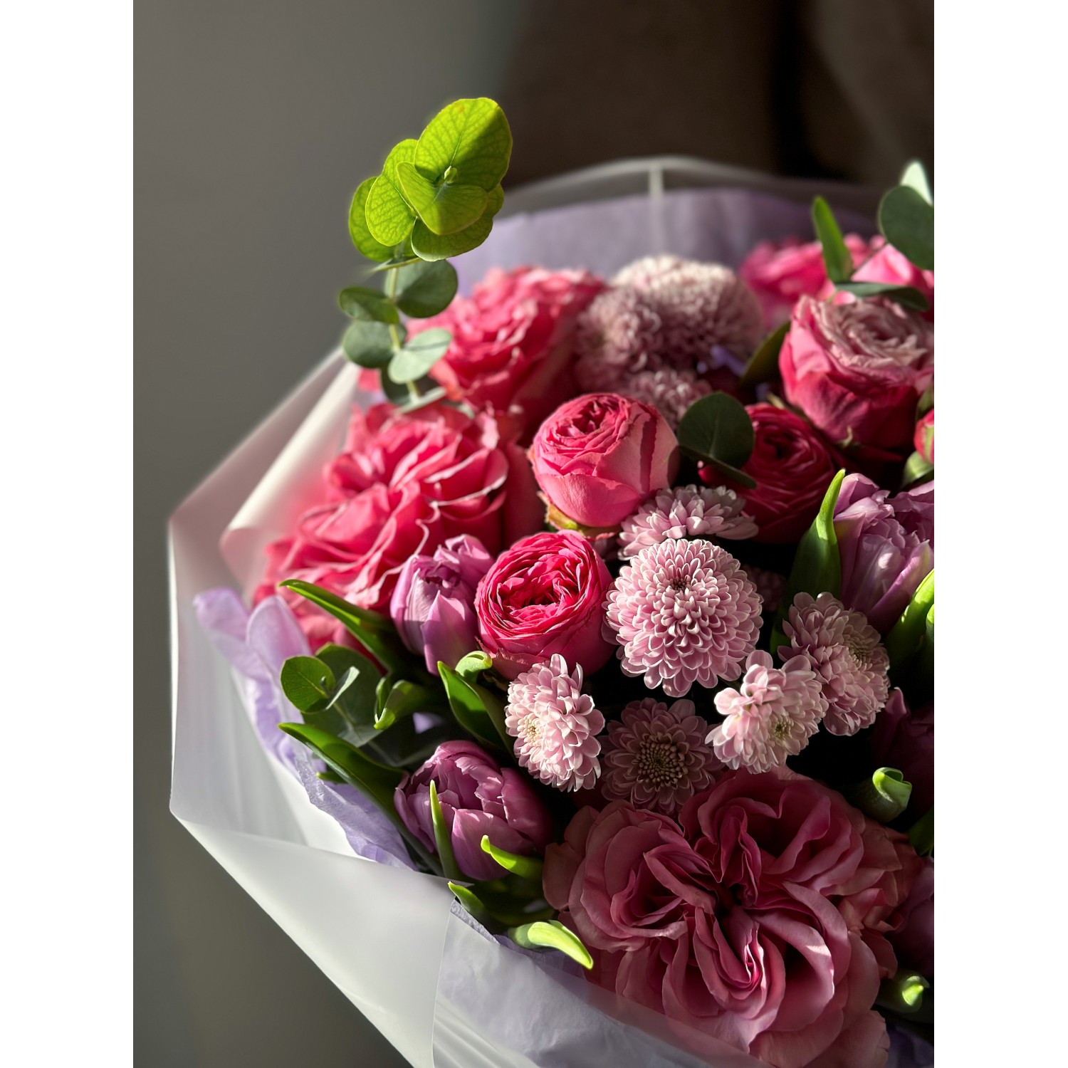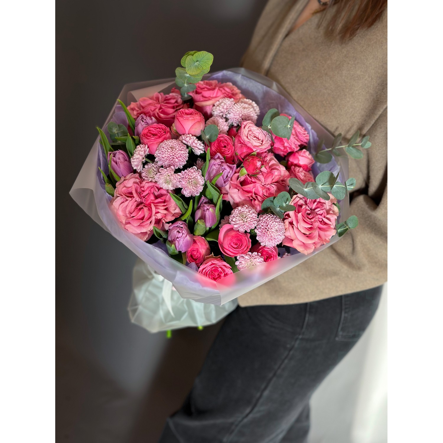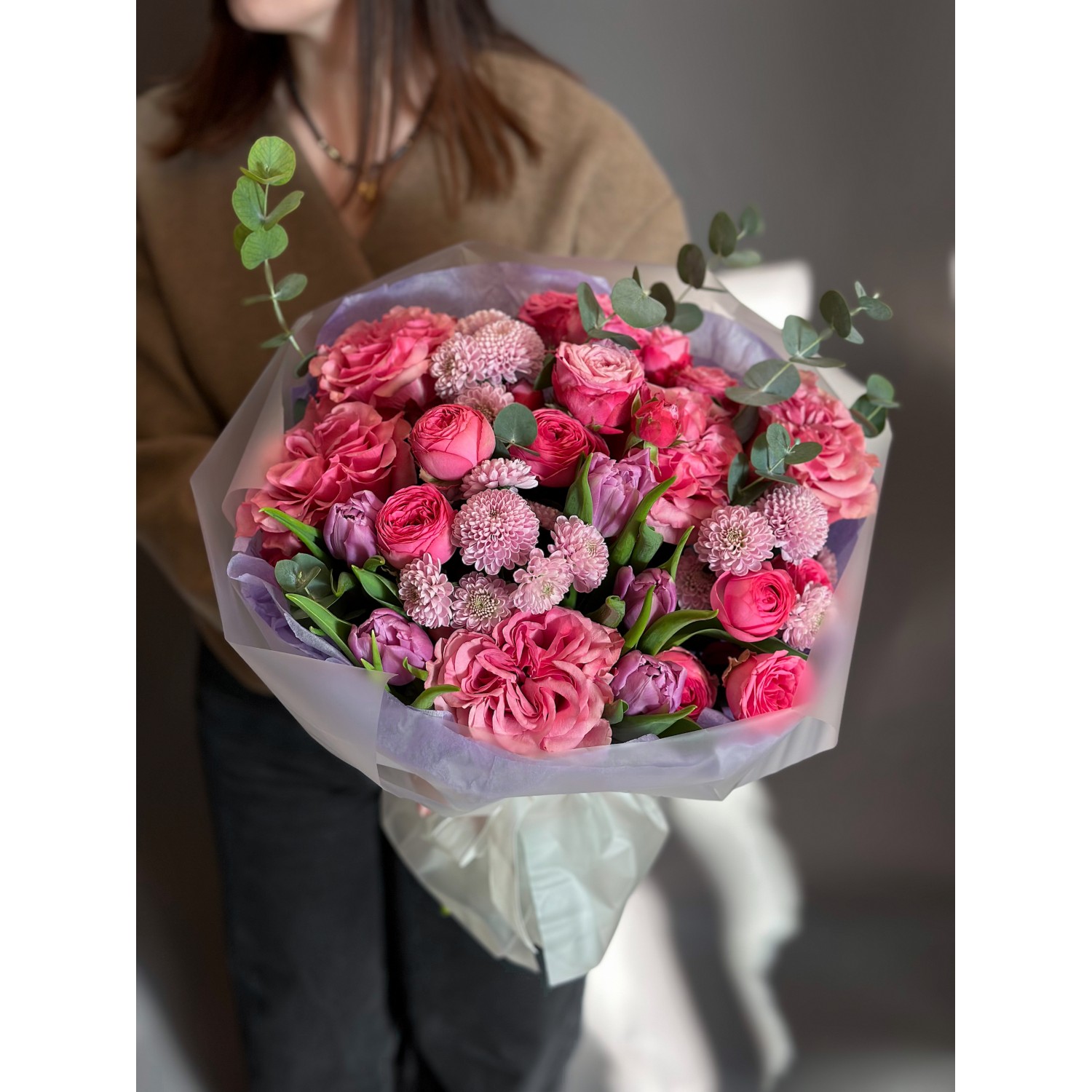 Наши любимые садовые пионовидные розы малинового цвета с тонким ароматом в сочетании с модными кустовыми хризантемами и пионовидными тюльпанами в актуальном исполнении. Особый акцент расставляет ароматный эвкалипт, который добавляет букету воздушность и освежает его своим мятно-серым оттенком.