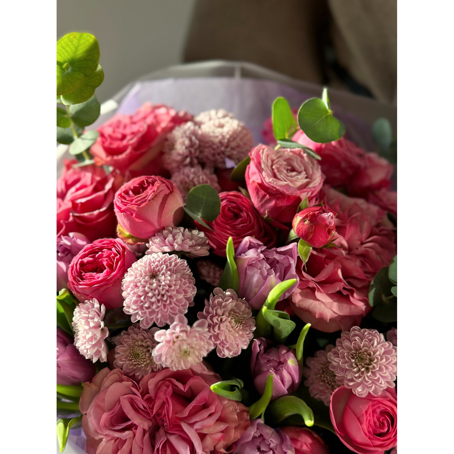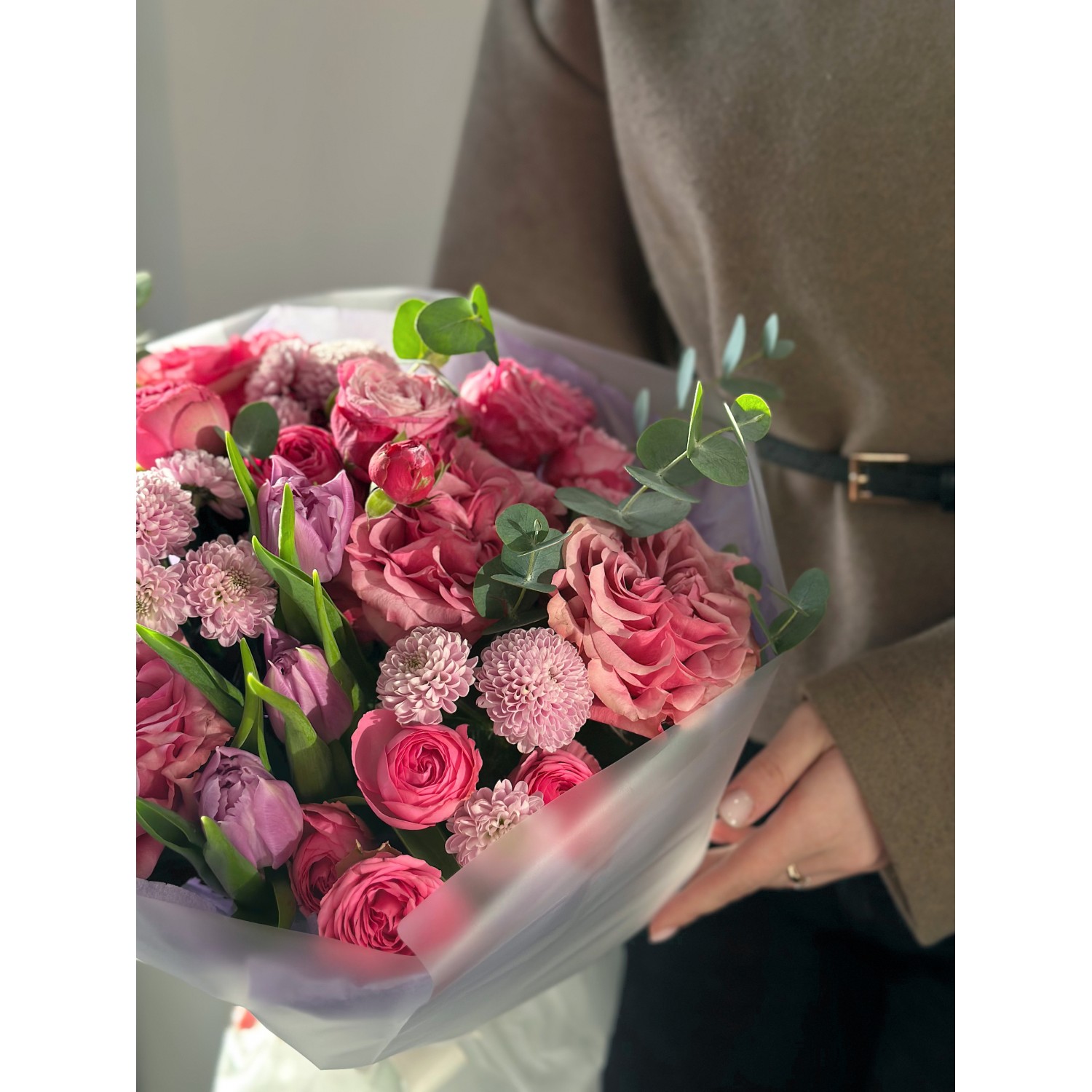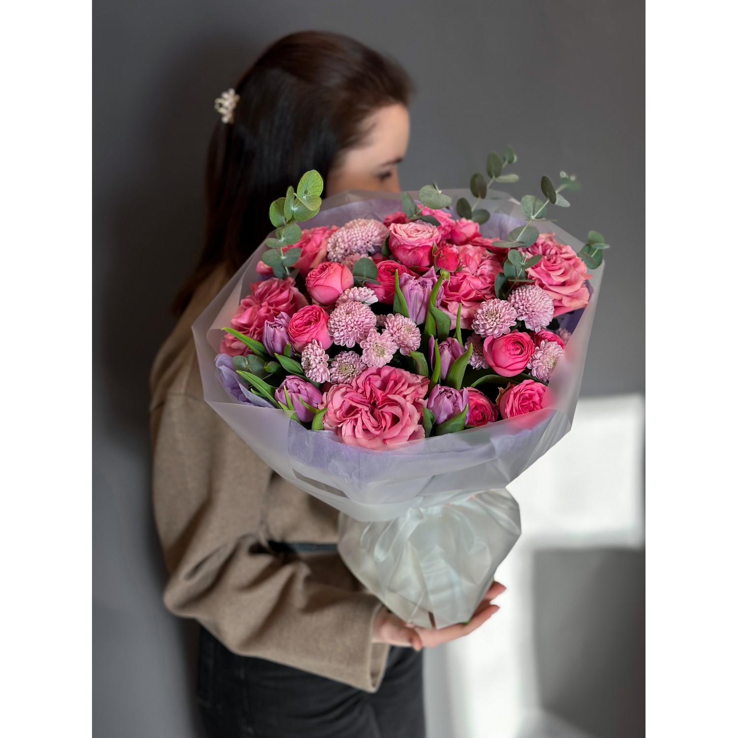 Наши любимые садовые пионовидные розы малинового цвета с тонким ароматом в сочетании с модными кустовыми хризантемами и пионовидными тюльпанами в актуальном исполнении. Особый акцент расставляет ароматный эвкалипт, который добавляет букету воздушность и освежает его своим мятно-серым оттенком.