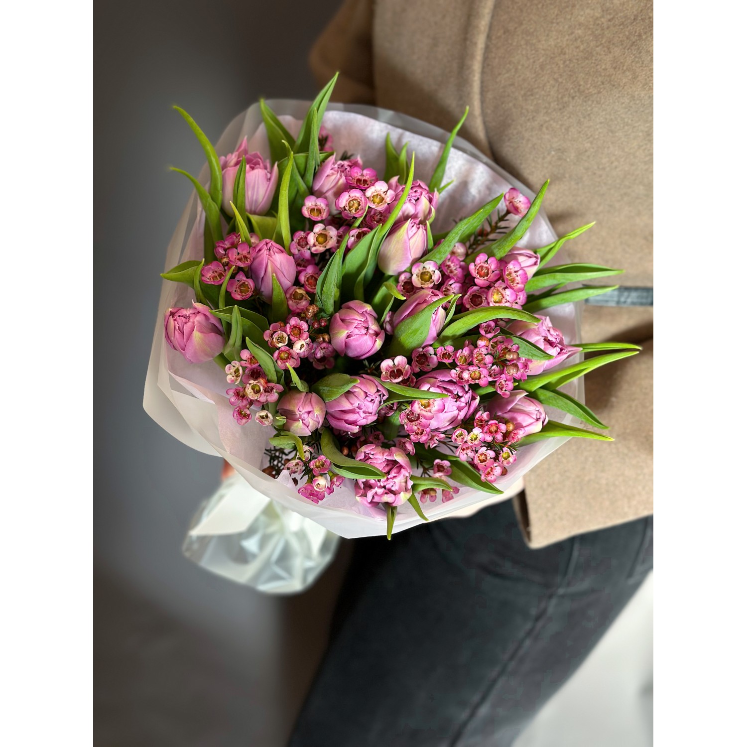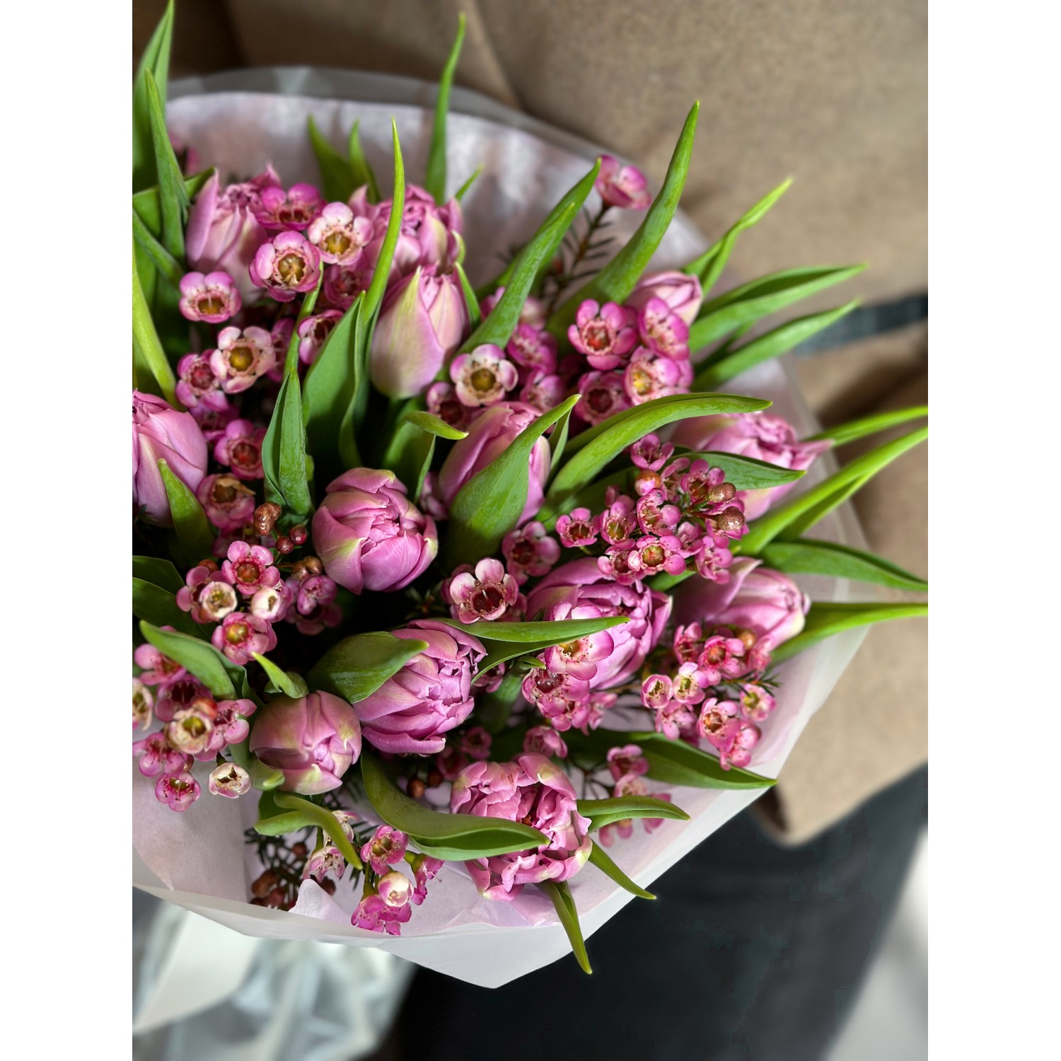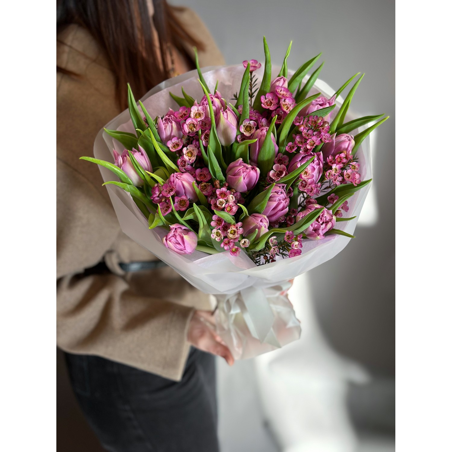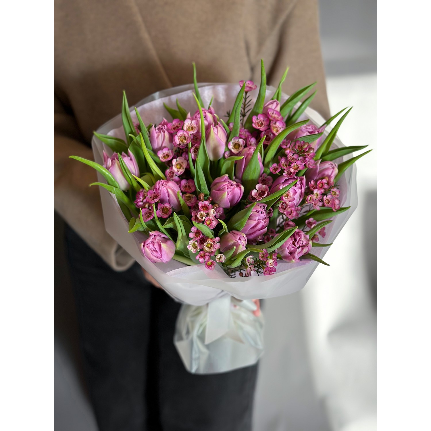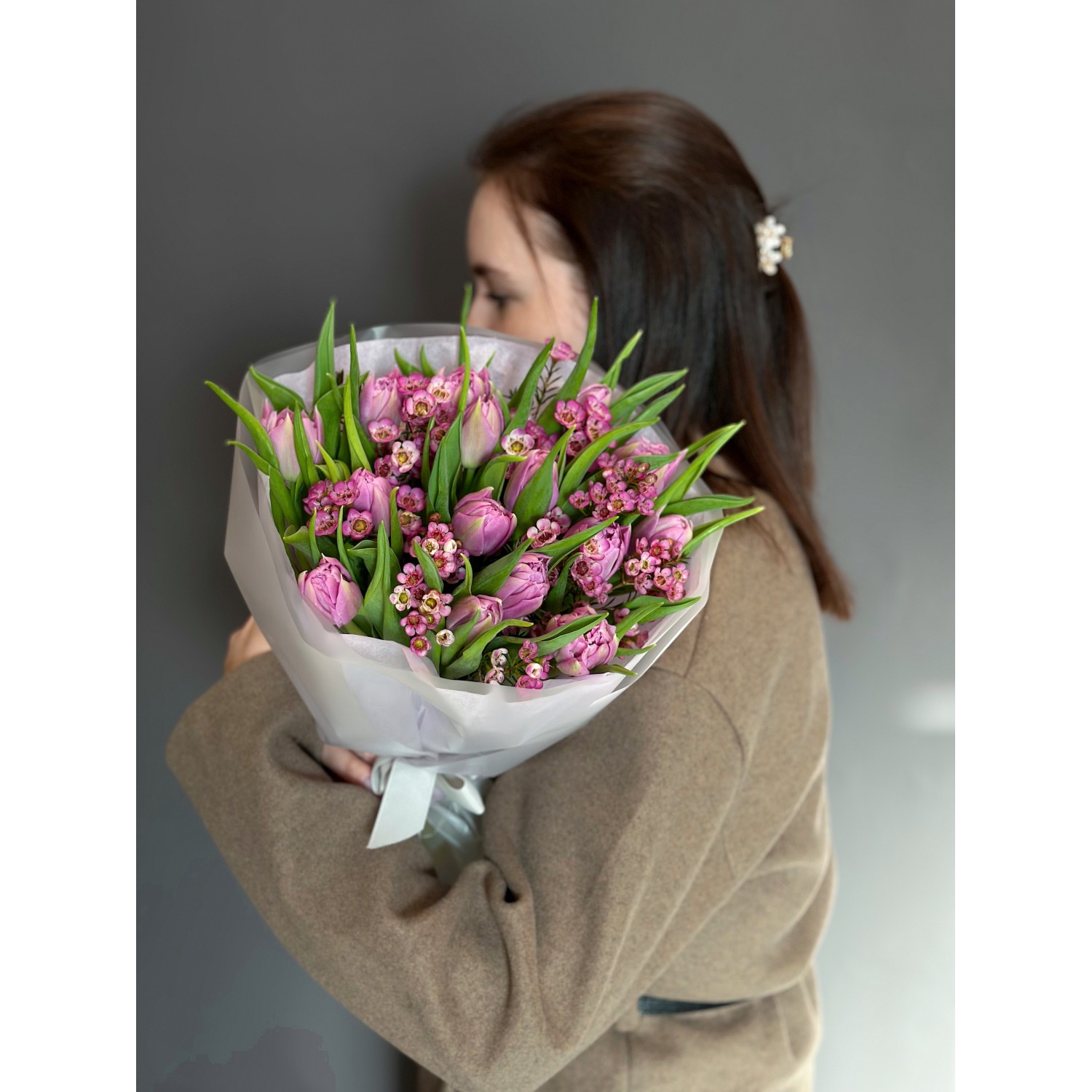 Пионовидные тюльпаны в лавандовом оттенке, соцветия хамелациума делают букет свежим и ярким, но не кричащим.