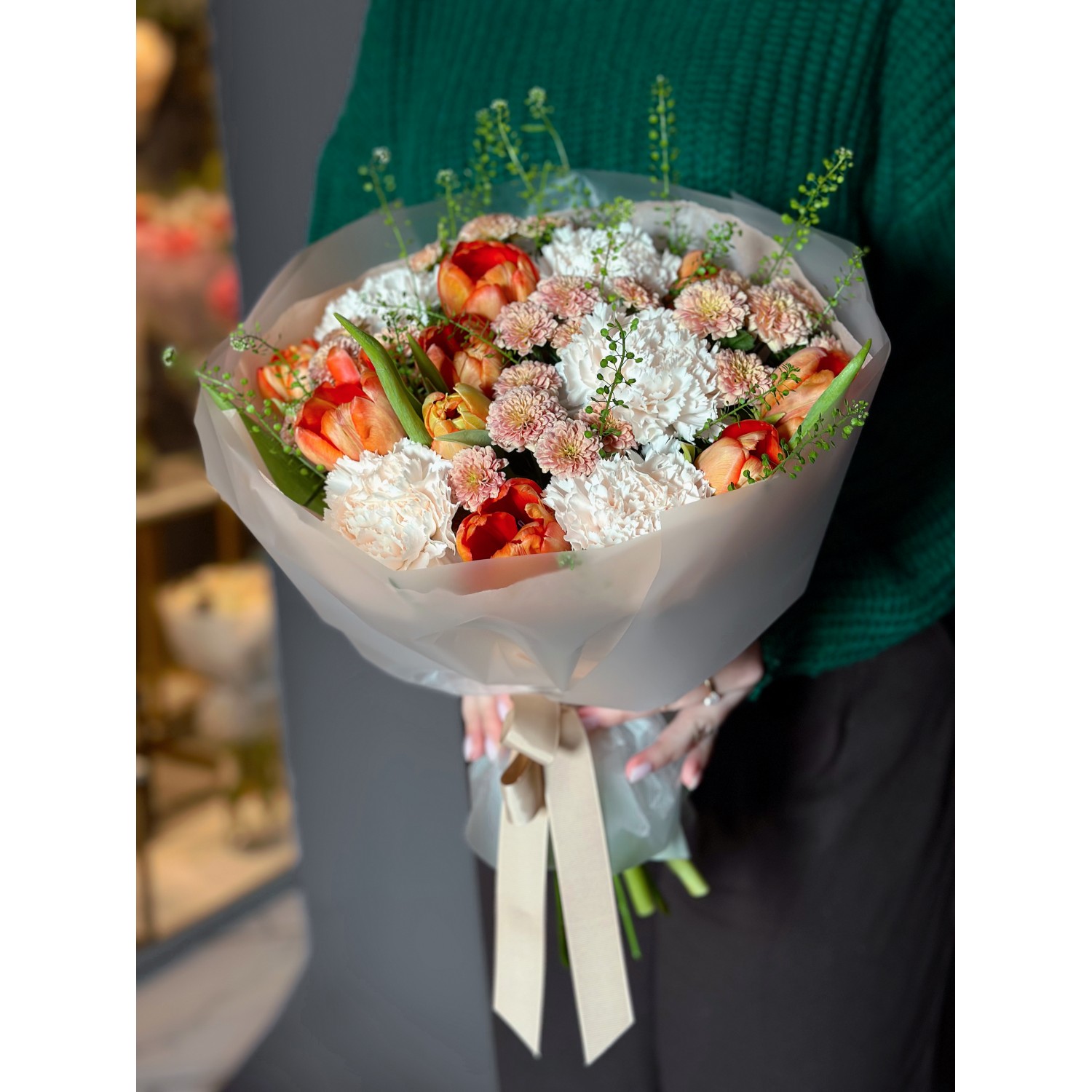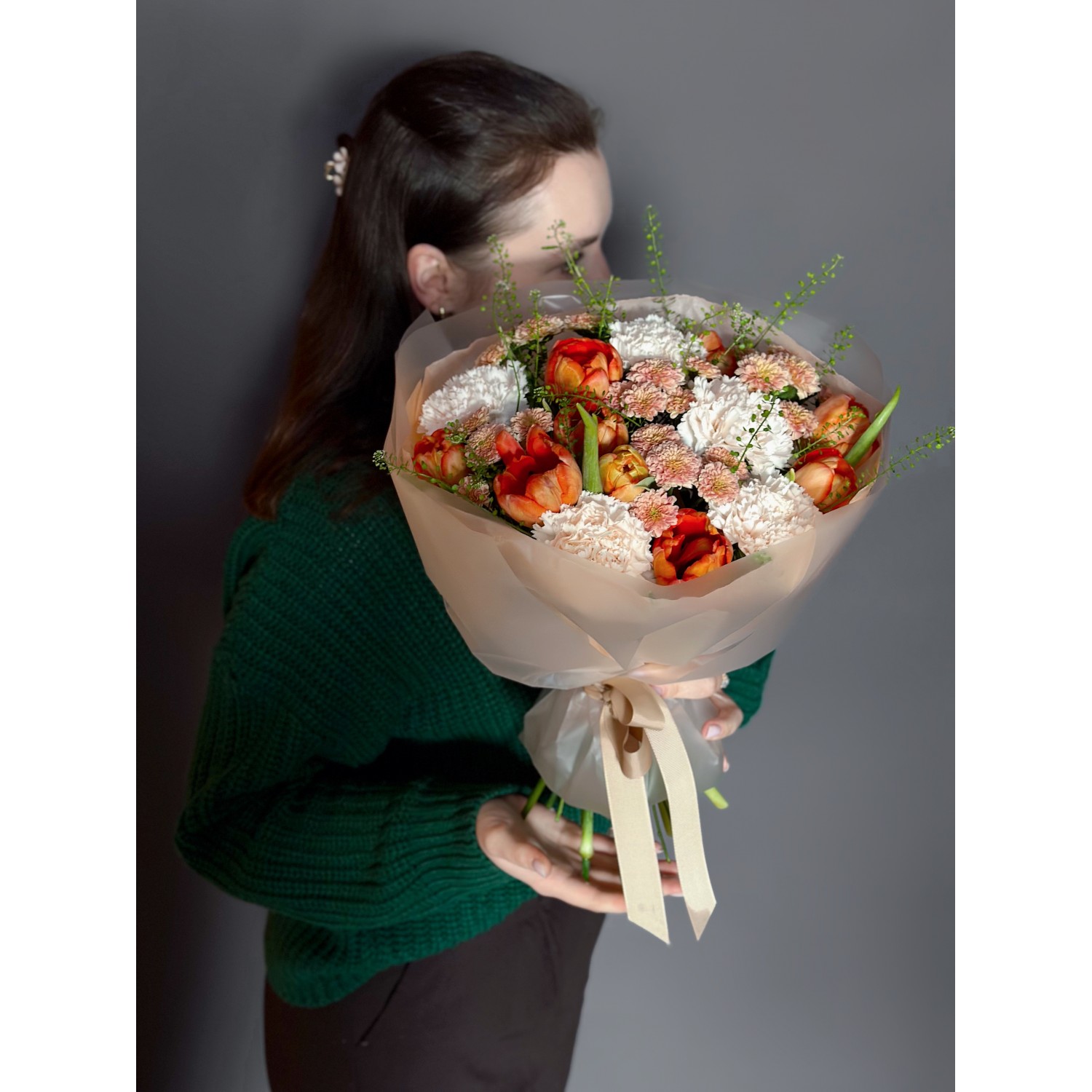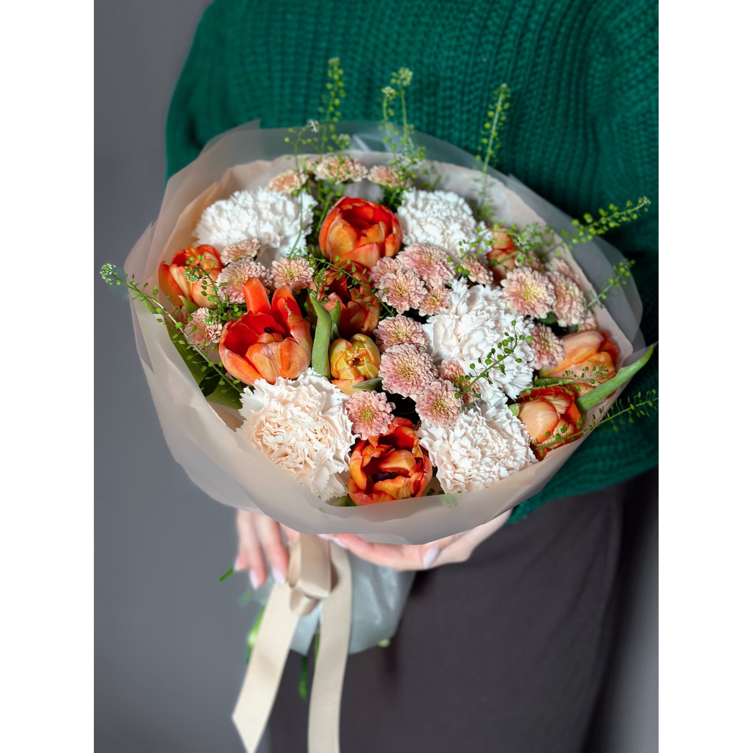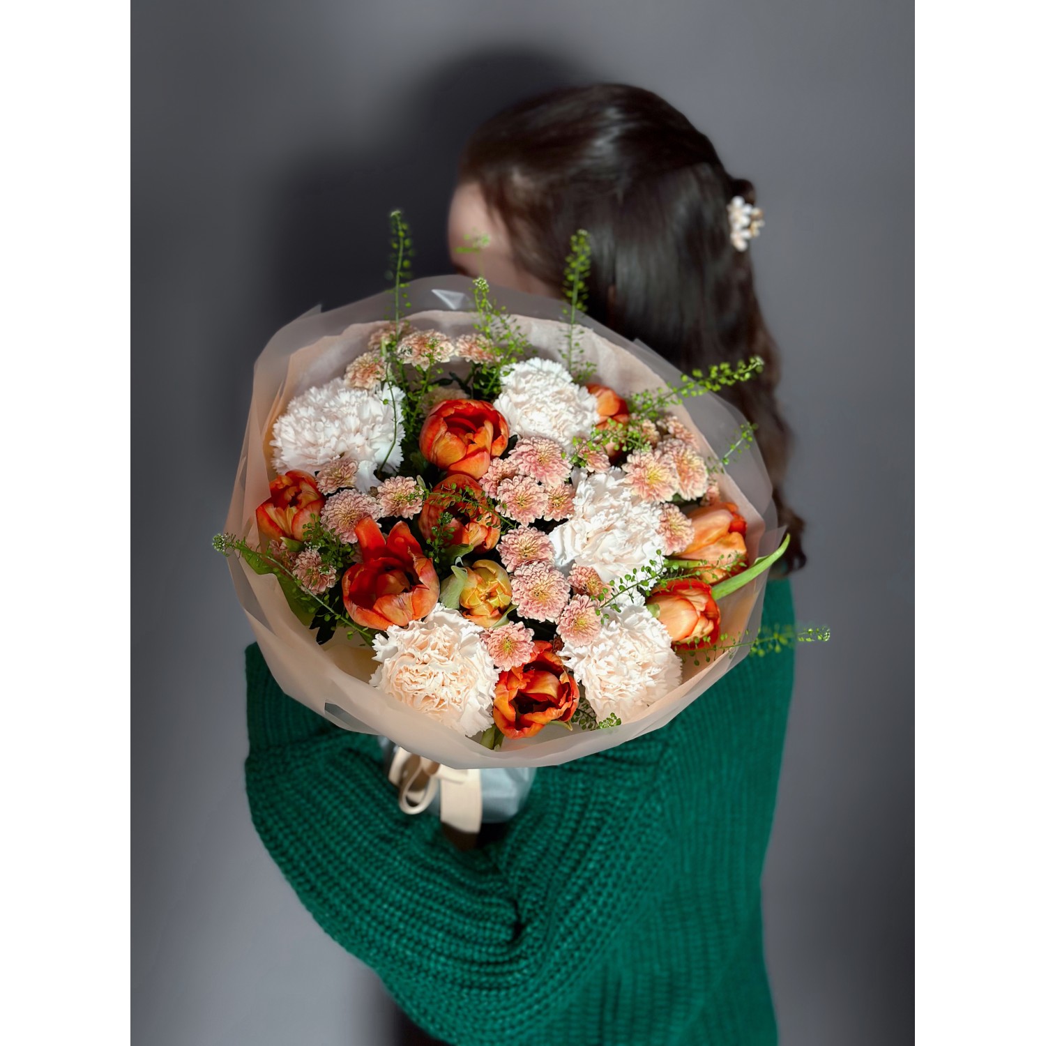 Букет с ярким весенним настроением: пионовидные оранжевые тюльпаны, персиковая кустовая хризантема, сортовые гвоздики и нежная зелень липидиума.