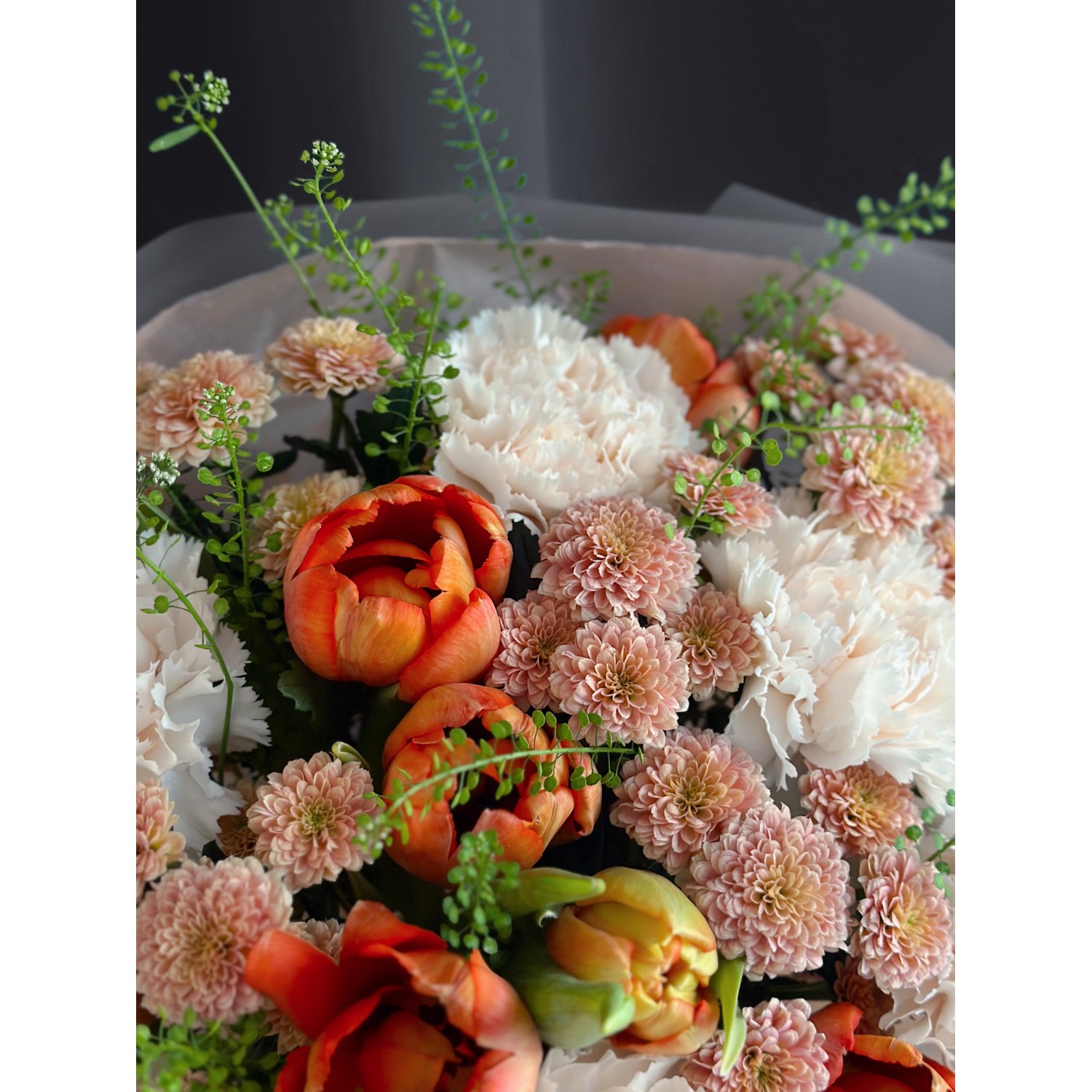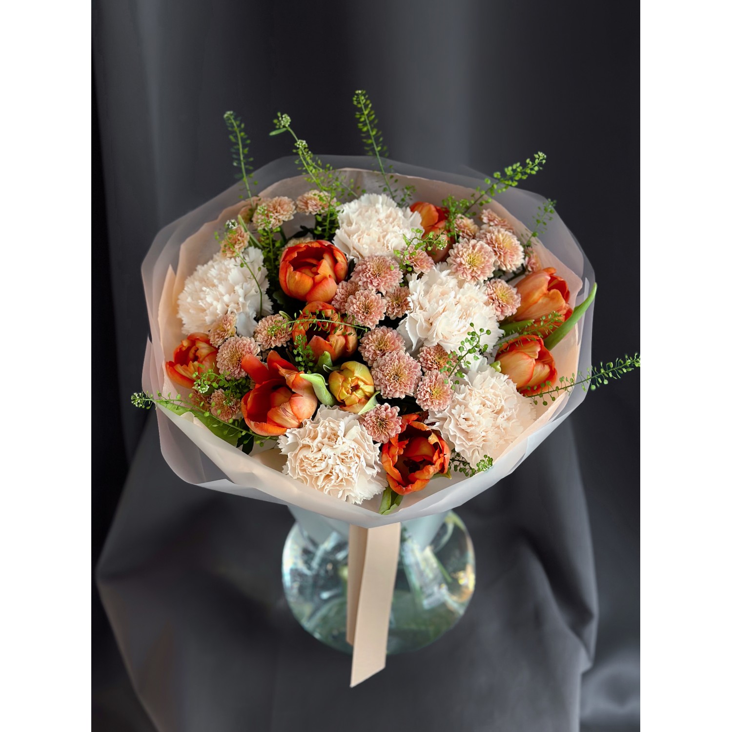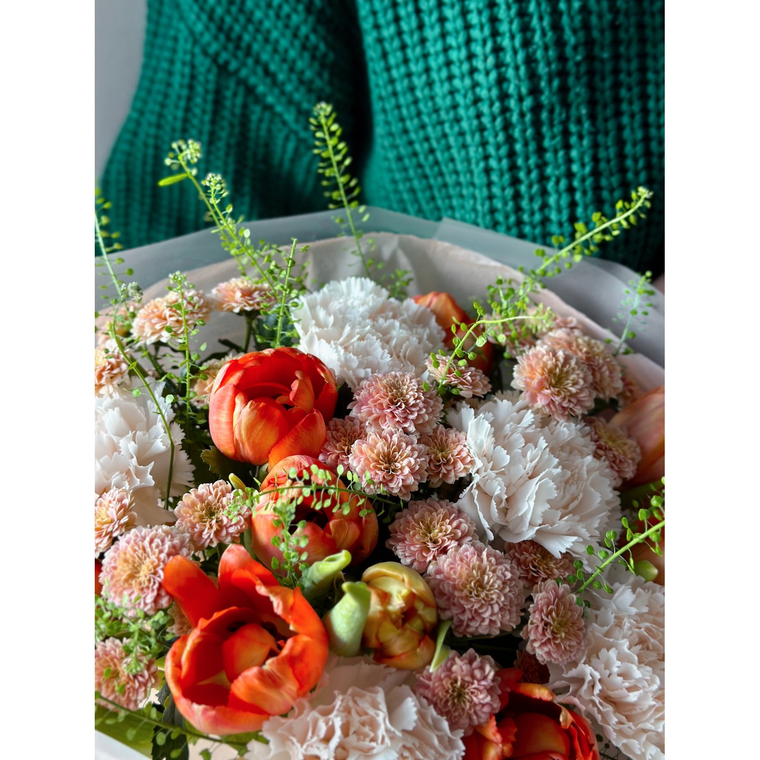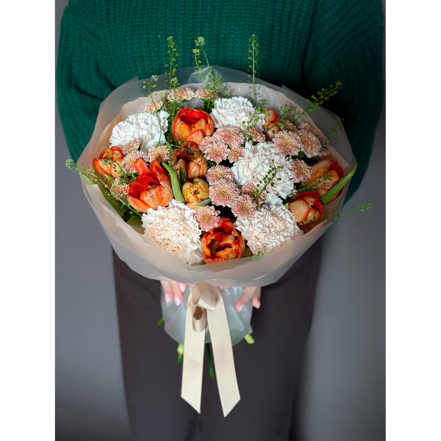 Букет с ярким весенним настроением: пионовидные оранжевые тюльпаны, персиковая кустовая хризантема, сортовые гвоздики и нежная зелень липидиума.