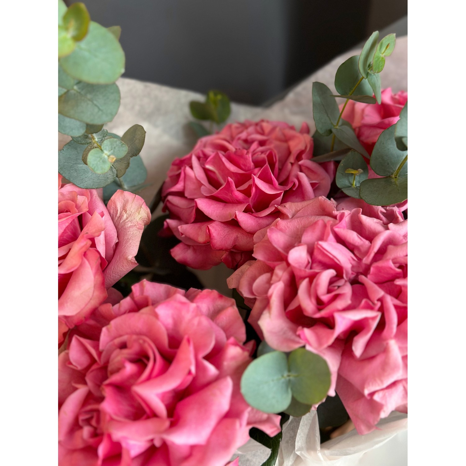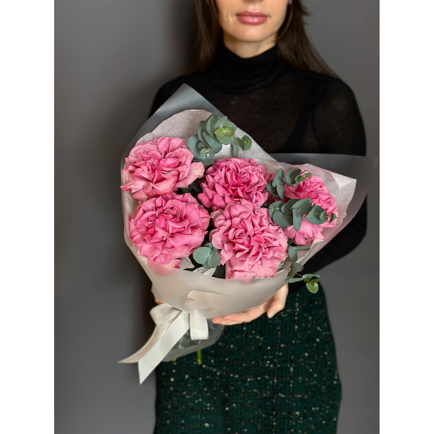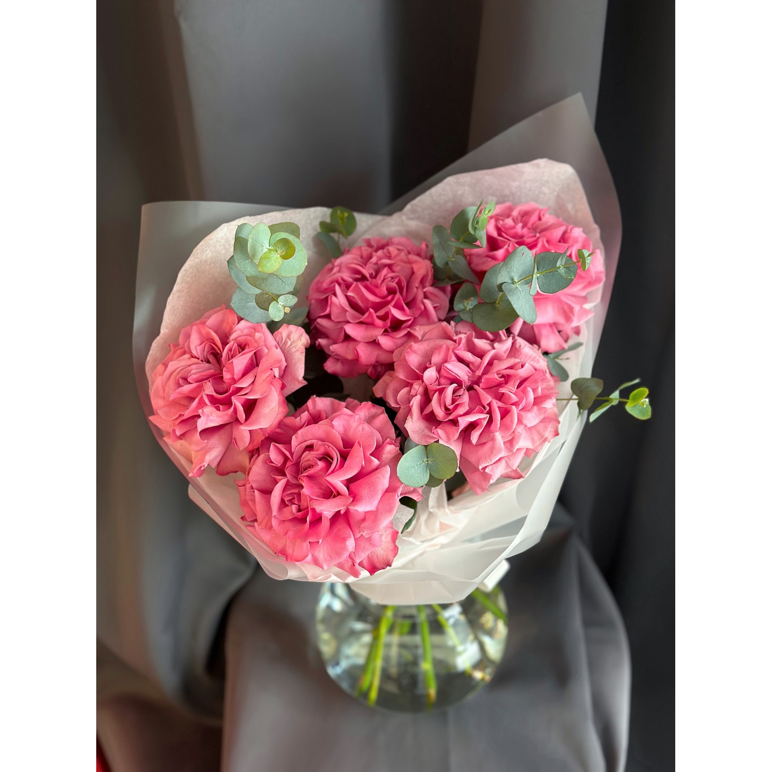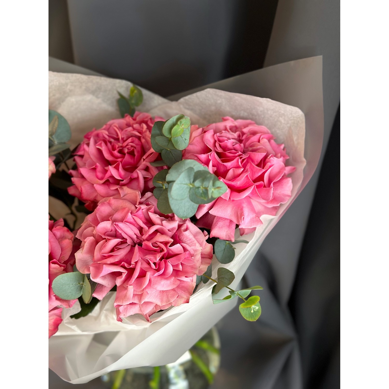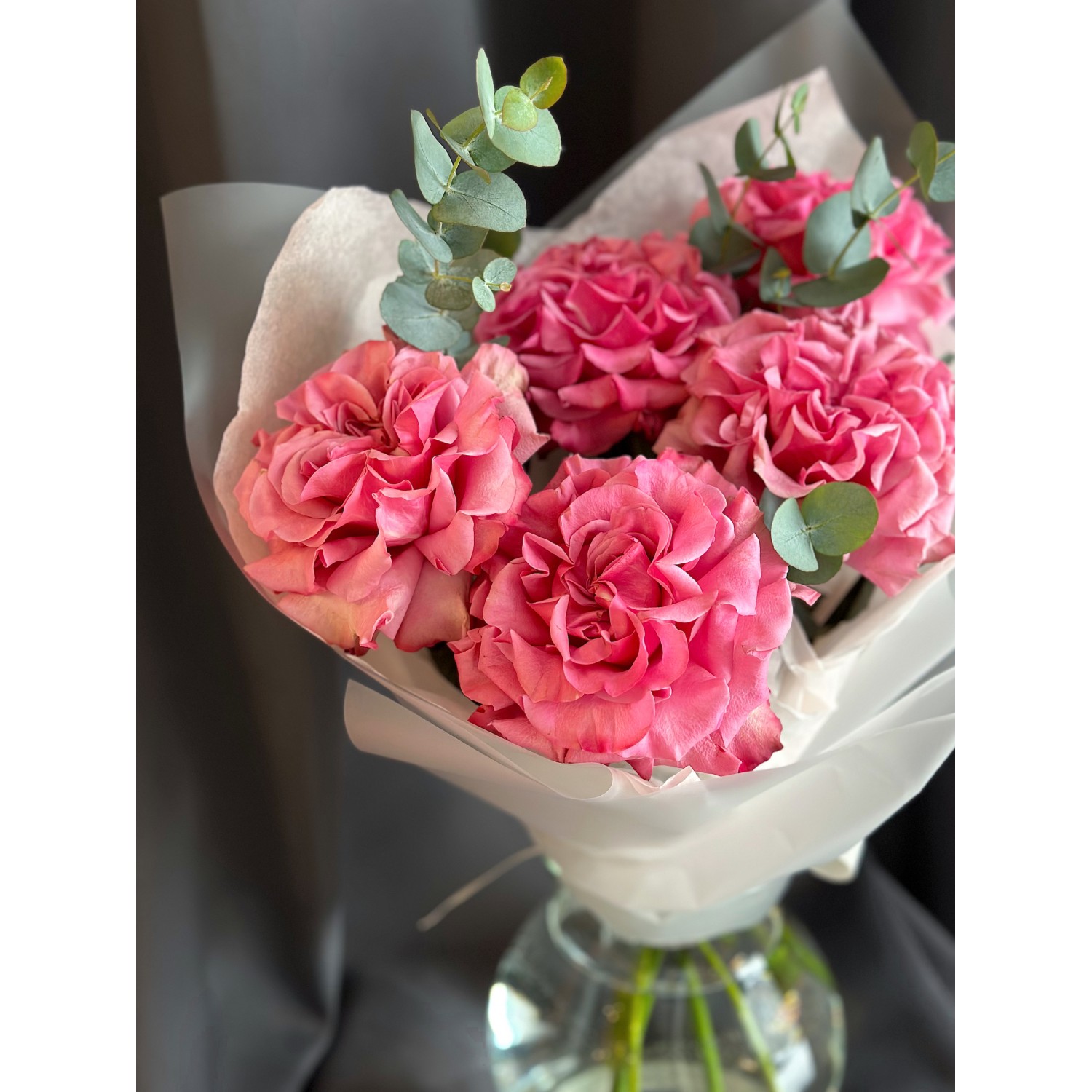 Букет №243 из французских малиновых роз с эвкалиптом в элегантной упаковке