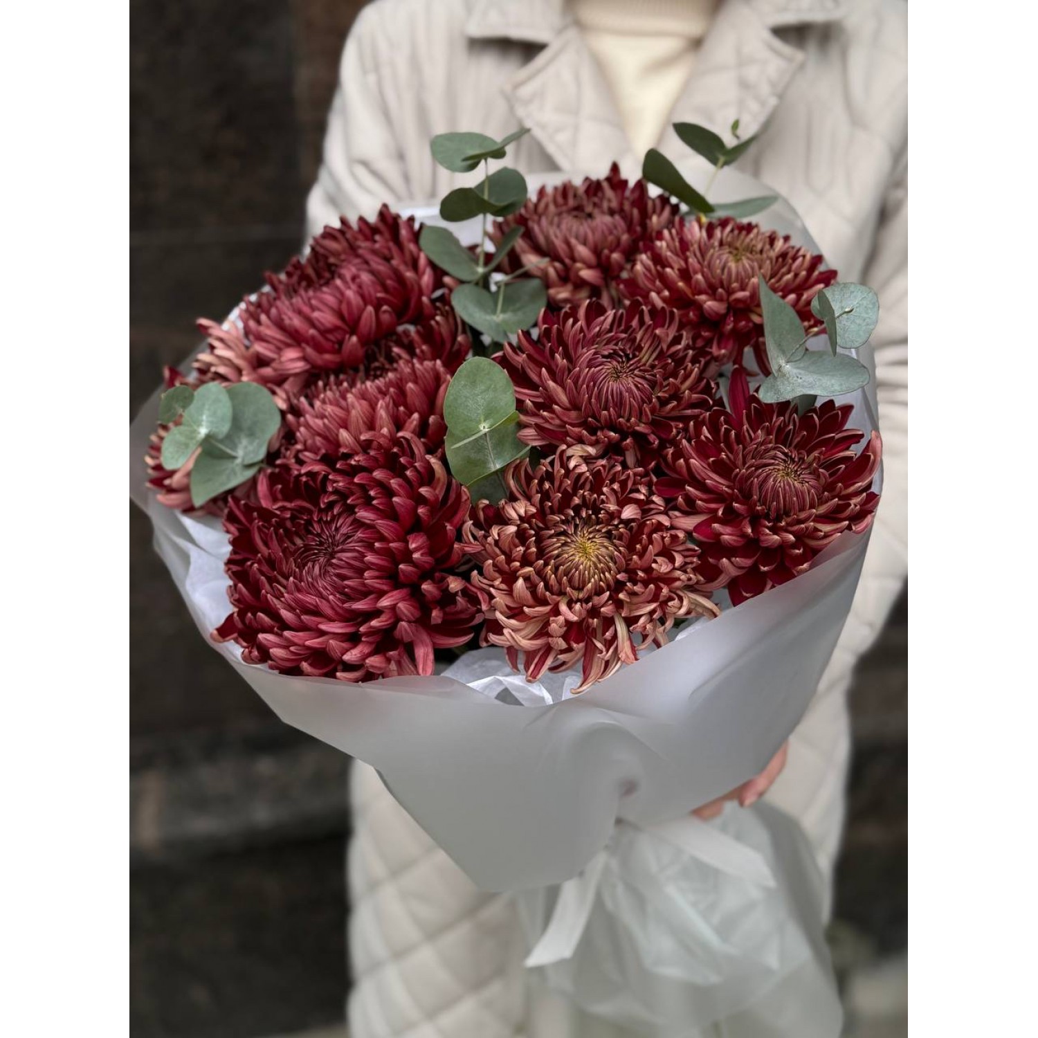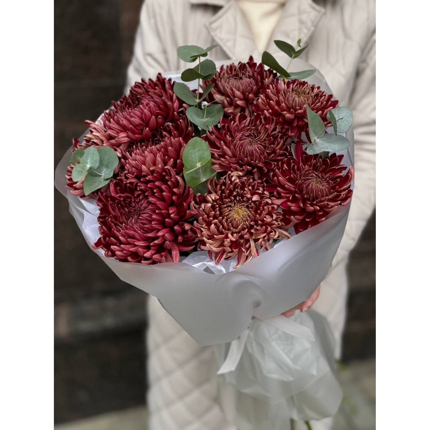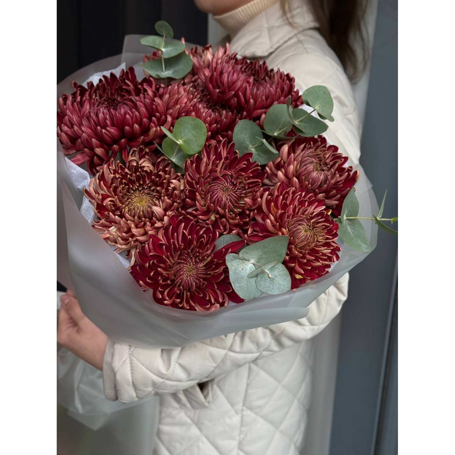 Потрясающий монобукет из стойкой сортовой хризантемы Bigoudi Red с ароматным эвкалиптом.